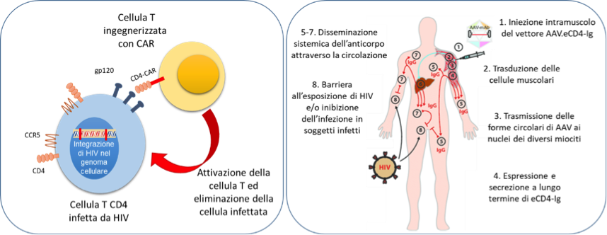 Matthew R. Gardner (Department of Infectious Diseases, The Scripps Research Institute, Jupiter, FL, USA), utilizzando un vettore adeno-associato, mira invece a promuovere la produzione da parte delle cellule muscolari di una molecola chimerica (eCD4-Ig) in grado di riconoscere le particelle virali circolanti e bloccarne la capacità infettiva legandosi sulla superficie (DOI: 10.1128/JVI.02011-17). Questo approccio si è dimostrato efficace sia nel proteggere dall’infezione virale macachi sani, che nel mantenere la soppressione virale in animali già infetti alla sospensione della cART.