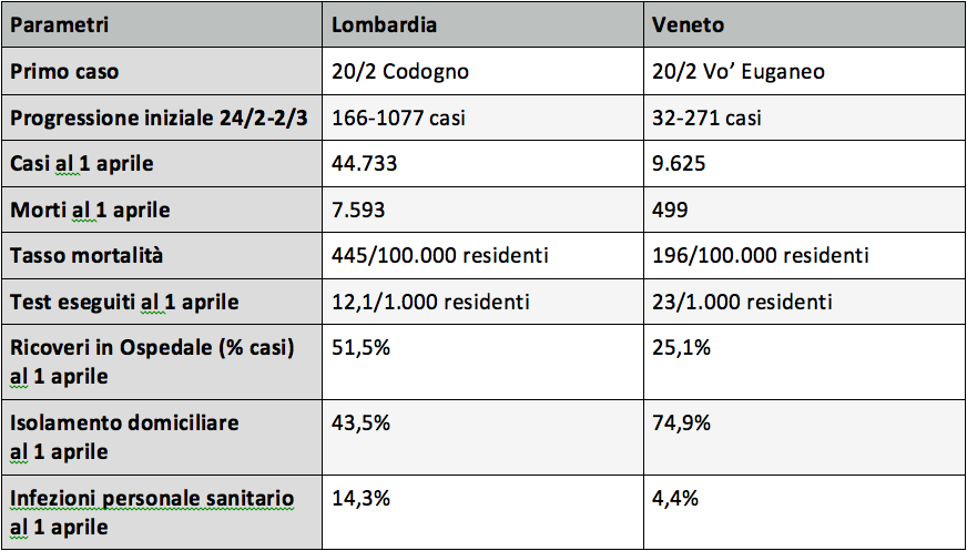 L'approccio basato sulla comunità in Veneto sembra essere associato a tassi di casi, ricoveri, decessi e infezioni negli operatori sanitari sostanzialmente ridotti rispetto all'approccio incentrato sul paziente in Lombardia. Certamente il nostro è uno studio osservazionale basato sull'esperienza di due sole regioni e, a causa di questa sua natura, è difficile trarre relazioni causali incontestabili. La Lombardia ha sperimentato una più rapida esplosione iniziale di casi, e se l'esordio fosse stato più lento, ci sarebbe stato, probabilmente, il tempo di organizzare e attuare più misure di salute pubblica per ridurre la trasmissione nella comunità.