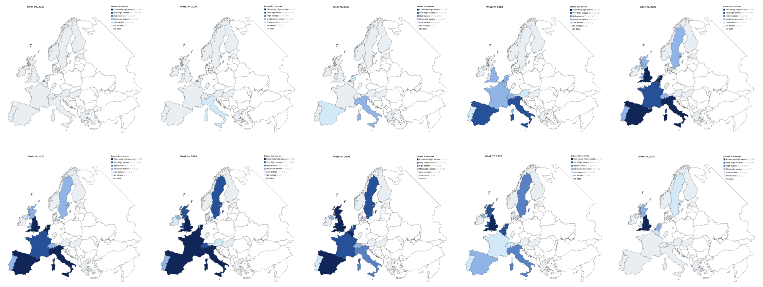 Euromomo è il sistema europeo di sorveglianza della mortalità che riceve i dati campione dai sistemi dei paesi aderenti. A partire dalla settimana 9 ha rilevato un eccesso di mortalità in Italia, nella settimana successiva anche in altri paesi. Dopo la settimana 14 la mortalità ha iniziato a tornare nella norma e nella settimana 18 solo in Inghilterra si continua a registrare una mortalità molto superiore alla media degli anni precedenti.