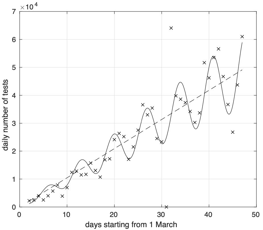 Questo si vede chiaramente nella figura 8, col numero di test analizzati al giorno che cresce a grande scala temporale in modo lineare nel tempo, secondo il segmento tratteggiato, ma con delle variazioni periodiche settimanali di ampiezza anch’essa crescente linearmente col tempo.