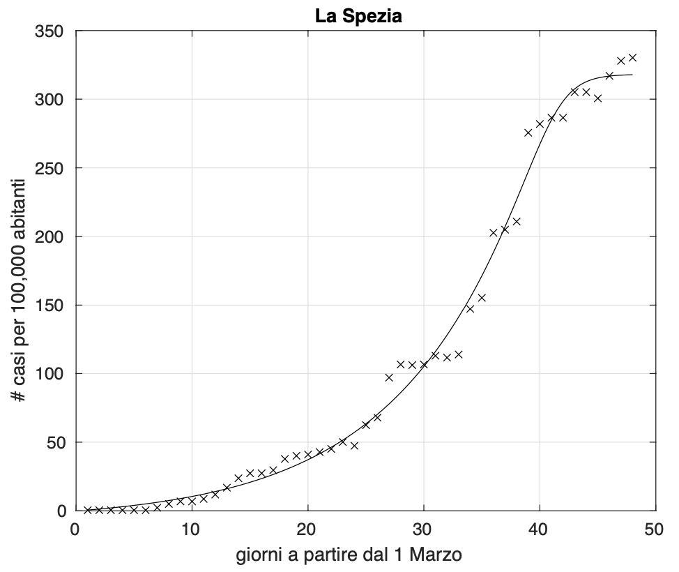 Figura 7. Sequenza del numero dei contagiati osservati nella provincia di La Spezia. Il miglior fit con un modello logistico generalizzato è sovrapposto ai dati.