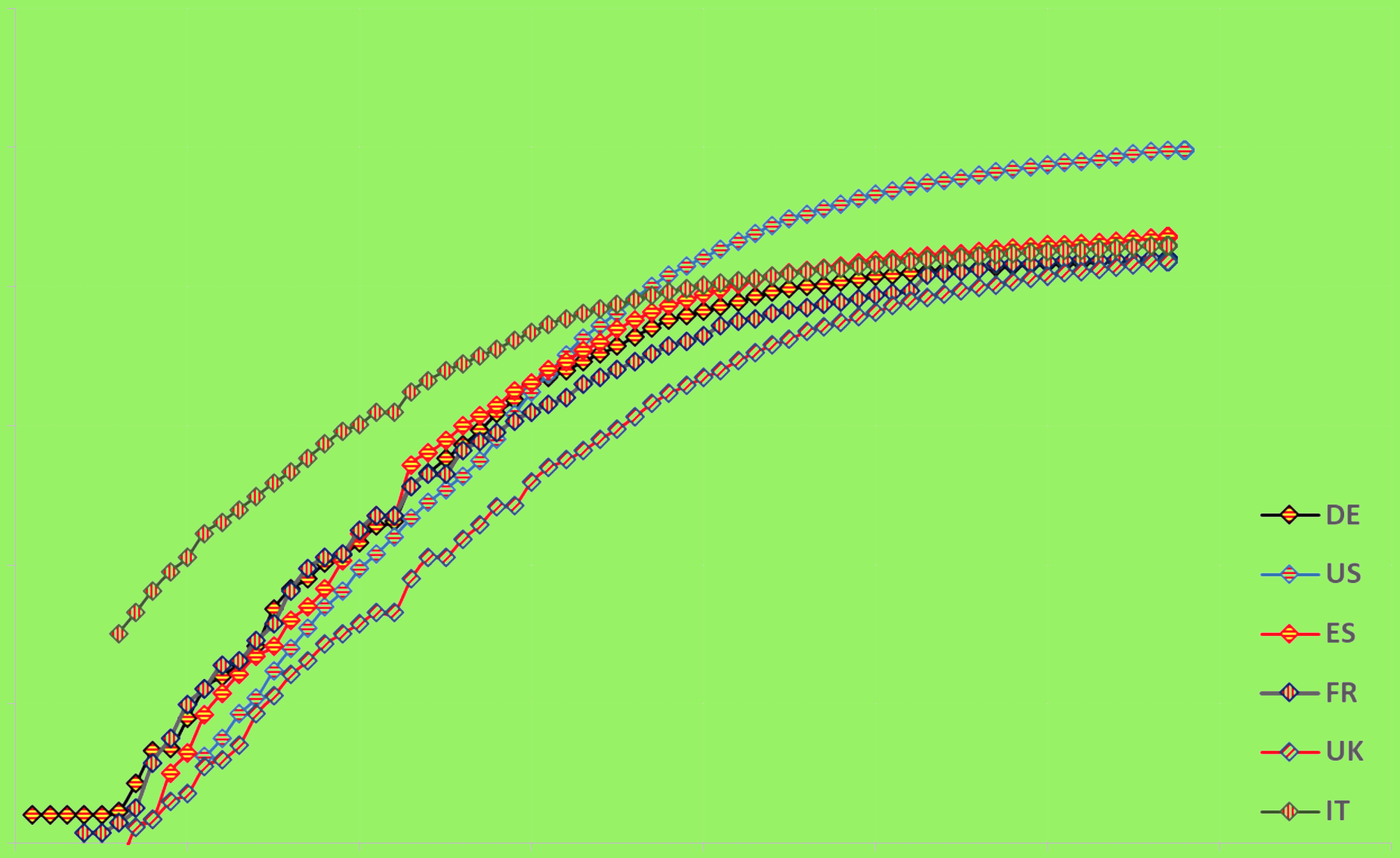 Tra i vari aspetti affrontati nel sito COVID-19, in questo articolo ci si sofferma sulla diffusione della pandemia nelle sei nazioni che ospitano, complessivamente, il 65% circa dei casi oggi rilevati in tutto il mondo: Italia (IT, 60 milioni di abitanti), Stati Uniti (US, 330 milioni di abitanti ), Germania (DE, 83 milioni di abitanti), Spagna (ES, 47 milioni di abitanti), Regno Unito (UK, 67 milioni di abitanti) e Francia (FR, 67 milioni di abitanti). Nel grafico interattivo qui sotto concentriamo l’attenzione sulle curve più significative, quelle dei decessi, confrontandole.