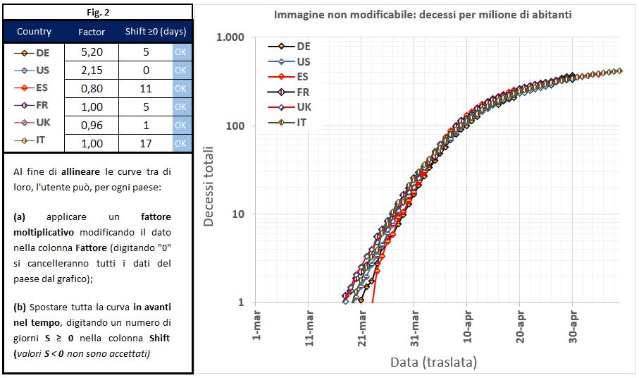 Invitiamo a questo punto il lettore ad esplorare personalmente l’interattività del grafico. Applicando le operazioni di cui sopra, ovvero scegliendo nella tabella di controllo i parametri giusti per ogni paese, ed escluse le fasi iniziali, possiamo portare tutte le curve ad un buon livello di sovrapposizione, con una accuratezza sorprendente. I parametri giusti e il risultato finale sono riportati nella figura 2.