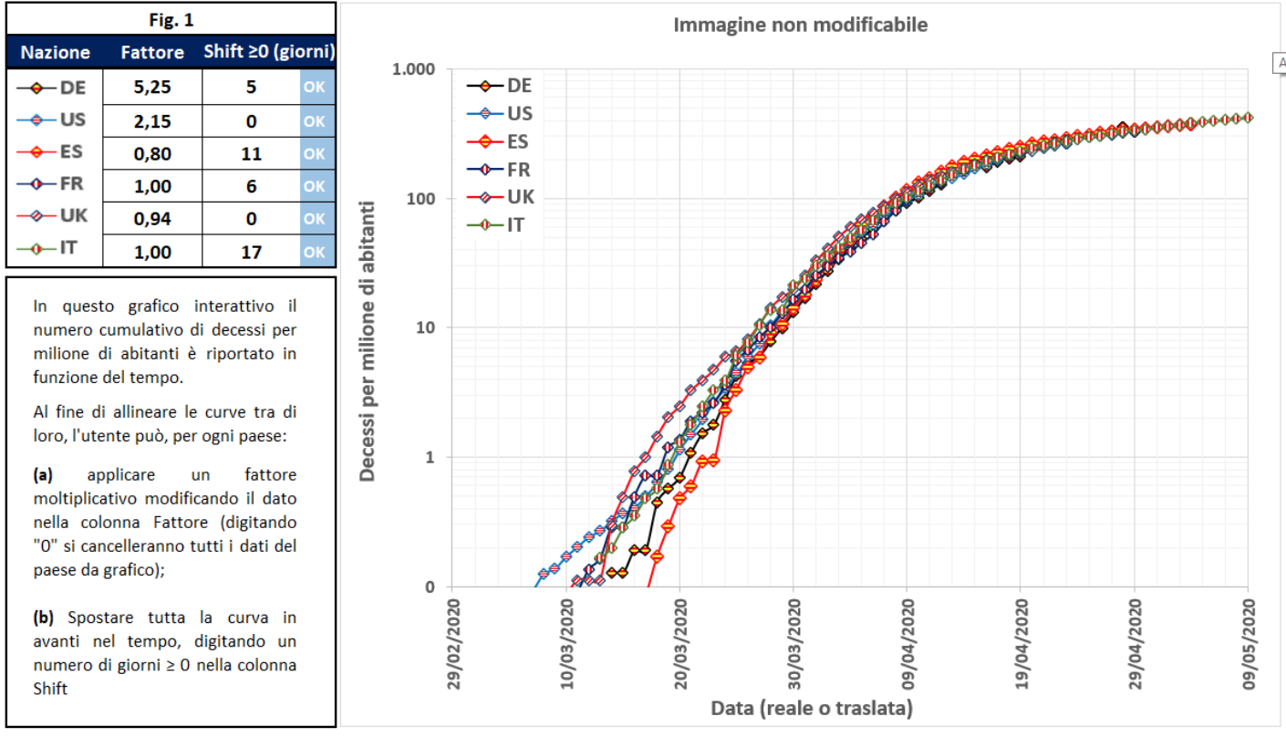 Invitiamo a questo punto il lettore ad esplorare personalmente l’interattività del grafico. Applicando le operazioni di cui sopra, ovvero scegliendo nella tabella di controllo i parametri giusti per ogni paese, ed escluse le fasi iniziali, possiamo portare tutte le curve ad un buon livello di sovrapposizione, con una accuratezza sorprendente. I parametri giusti e il risultato finale sono riportati nella figura 2.