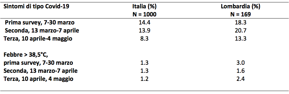 I dati, raccolti con metodologia CAWI (computer assisted web interviews), si riferiscono a domande poste ai cittadini relative alle loro condizioni nelle tre settimane precedenti la rilevazione. Nel periodo 13 marzo-7 aprile in Italia il 13.9% dei soggetti aveva riportato sintomi di tipo Covid-19 e l'1.3% febbre superiore a 38,5 gradi. In Lombardia le percentuali salivano al 20.7% per ogni sintomo e al 1.6% per la febbre oltre 38.5. Sia in Italia che in Lombardia la percentuale di soggetti che avevano riferito sintomi di tipo Covid-19 era più alta tra i giovani e i fumatori.