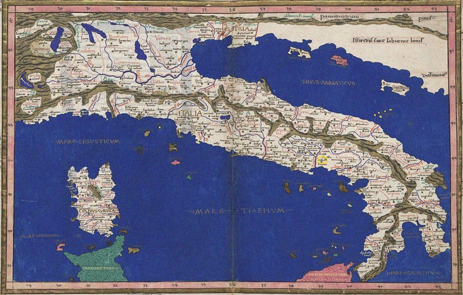 Cartina storica dell'Italia (inchiostro e colore su pergamena di Nicolaus Germanus, da un'edizione del 1467 della Cosmographia Claudii Ptolomaei).