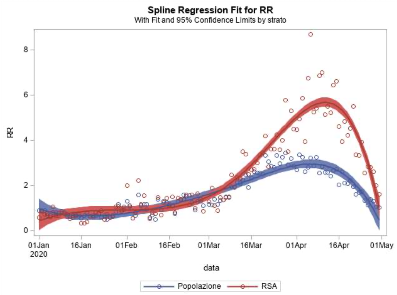 La figura 2 mostra l’andamento del rapporto decessi osservati e attesi a partire da inizio anno per la popolazione generale sopra i 70 anni e per la popolazione dei residenti nelle RSA: fino al 15 febbraio non c'è eccesso, poi fino al 15 marzo sale in maniera simile sia per la popolazione generale. A partire al 15 marzo il rapporto decessi osservati e attesi sale molto di più per la popolazione delle RSA fino a diventare il doppio rispetto al rapporto osservati attesi della popolazione generale intorno alla seconda settimana di aprile.