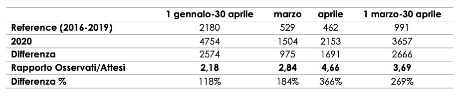 - Mentre a gennaio 2020 si è registrato un modesto difetto di mortalità rispetto agli anni precedenti, sono seguiti mesi in cui si è passati a un deciso eccesso sempre più marcato fino alla fine di aprile (fino a 4 volte più dell’atteso).