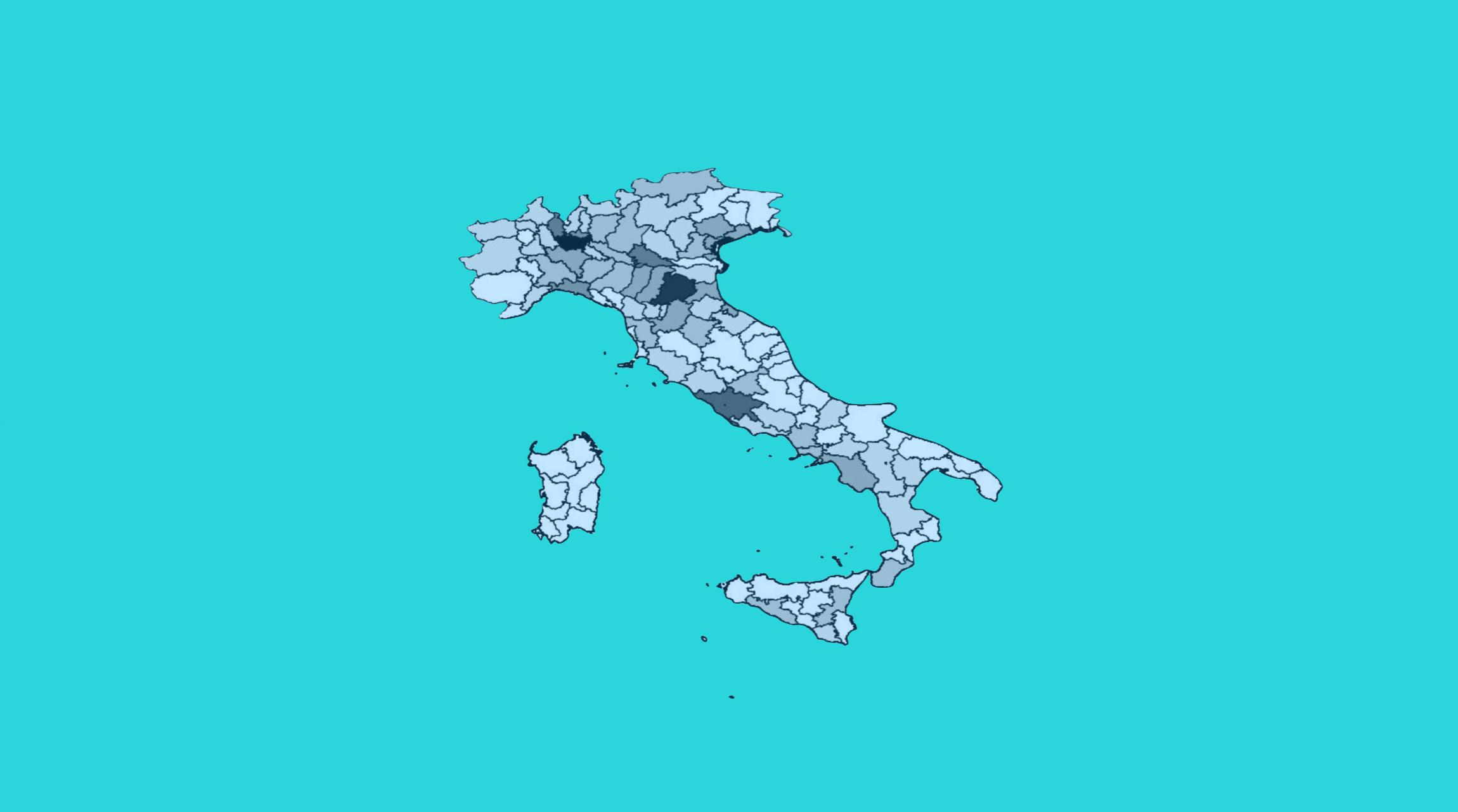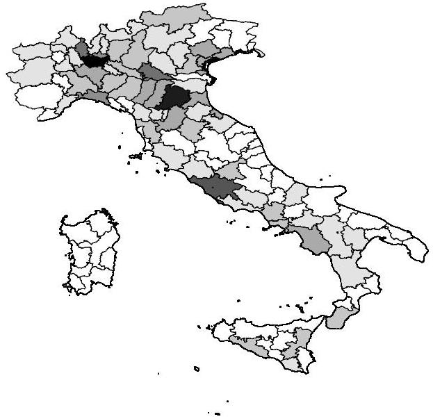 Figura 2 Distribuzione spaziale del numero di focolai nelle province italiane nel periodo dal 1 Giugno al 31 Luglio 2020. L’intensità decresce al crescere del numero di focolai nella provincia.