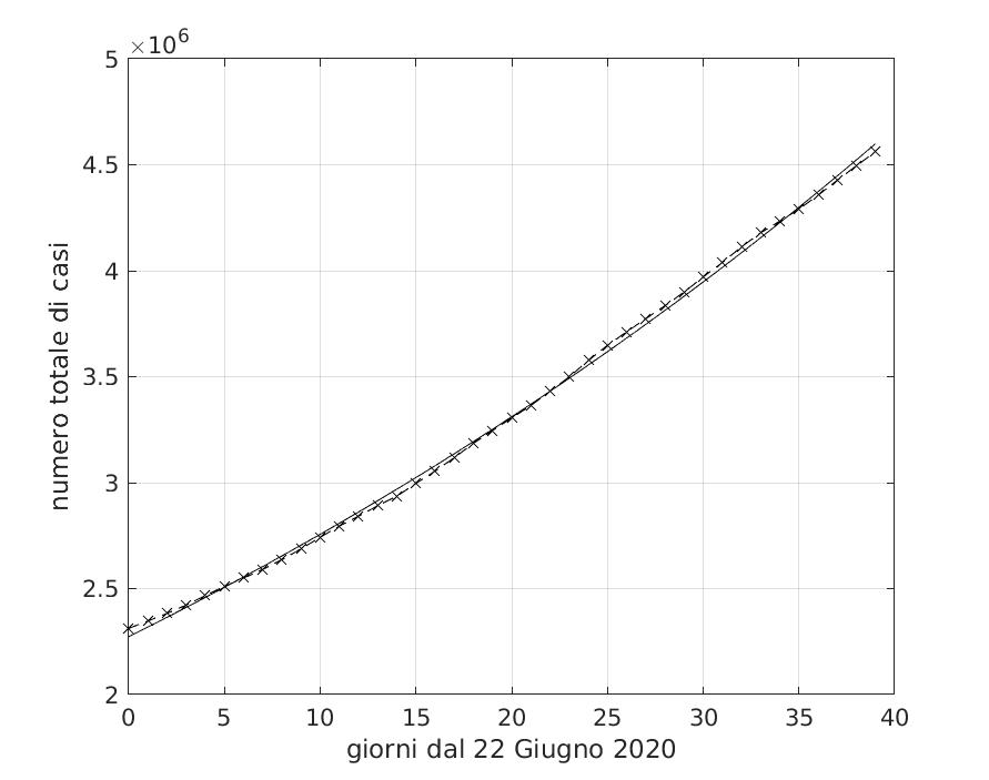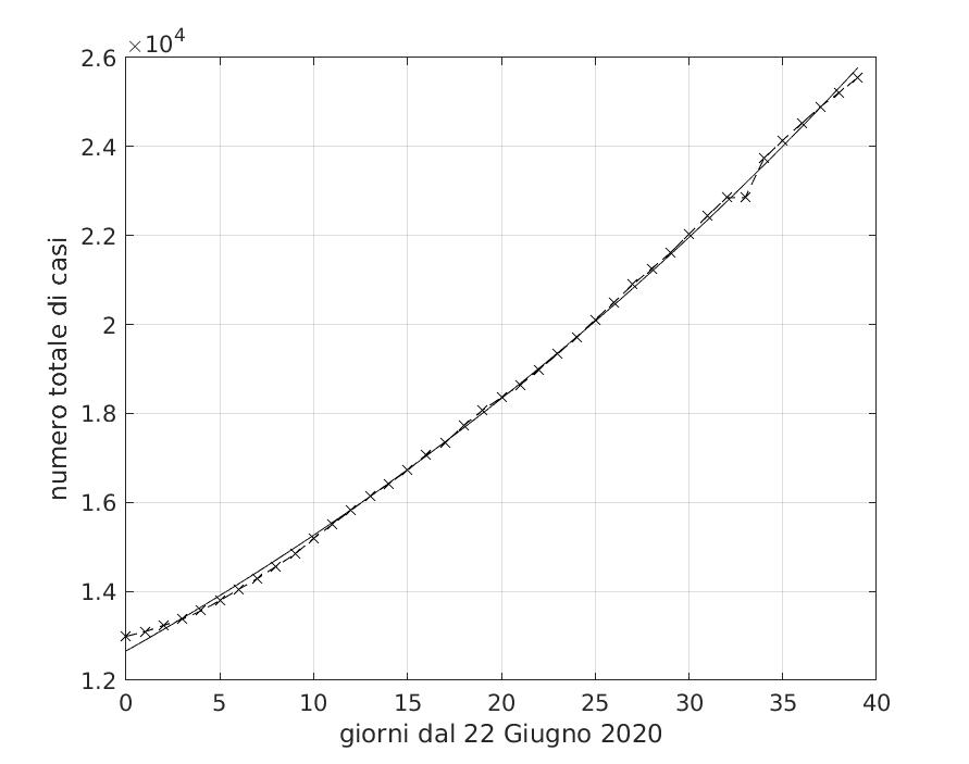 Figura 11 Andamento temporale del numero totale di soggetti trovati positivi al Covid-19 in Brasile nel periodo dal 22 Giugno al 31 Luglio 2020. Il miglior fit con un modello di tipo dapprima lineare e poi esponenziale è sovrapposto ai dati.