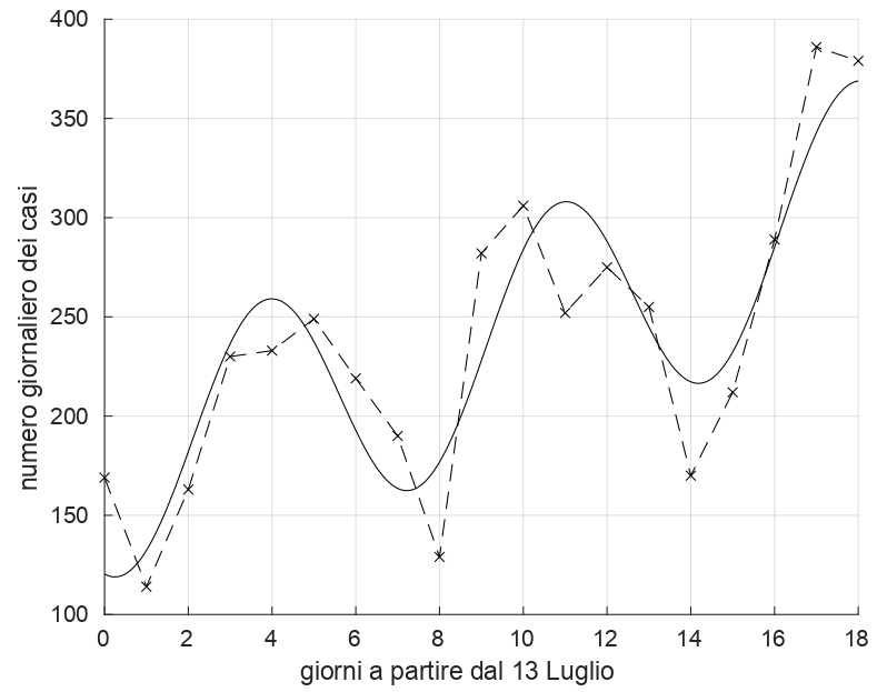 Figura 4 Andamento temporale dell’incidenza dei soggetti trovati positivi al Covid-19 in Italia nel periodo dal 13 al 31 Luglio 2020. Il miglior fit con un modello di tipo esponenziale con una componente periodica è sovrapposto ai dati.