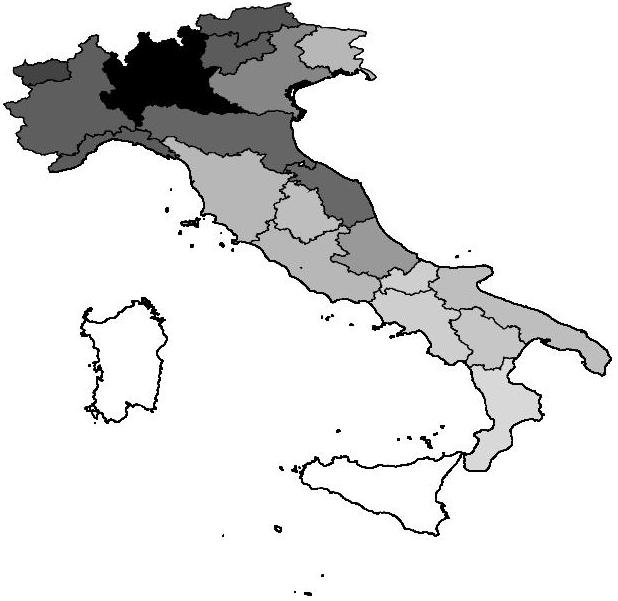 La percentuale del 2,5% di sieroprevalenza è stimata a livello nazionale. A livello regionale ci sono notevoli differenze di questa percentuale, anche di un ordine di grandezza. Il valore massimo è raggiunto dalla Lombardia, 7,5%, e quello minimo dalle due isole, Sicilia e Sardegna, 0,3%, con rapporto pari a 25. A livello provinciale il valore massimo sale al 24% a Bergamo. Nella figura 1 viene riportata la mappa delle regioni italiane con l’intensità che decresce al crescere della percentuale di sieroprevalenza. La media dei valori delle percentuali nelle regioni del nord (da Toscana ed Emilia Romagna comprese in su) è pari a circa 3,1% e per le regioni del sul è circa uguale a 0,95%. Questa differenza è statisticamente significativa.