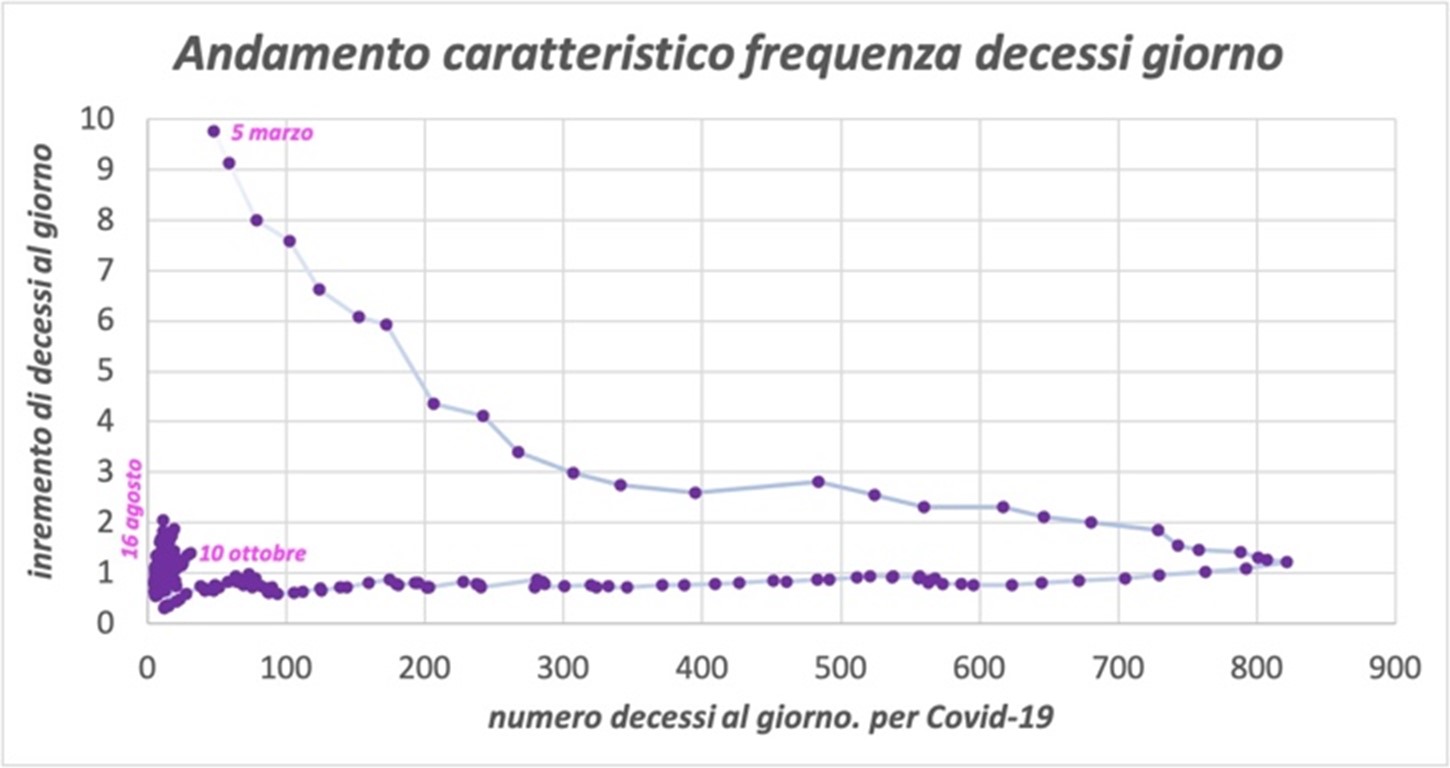 I decessi sono ahimè purtroppo una quota relativamente stabile dei ricoverati in Terapia Intensiva, anche se fortunatamente la crescita del loro numero che all’inizio dell’epidemia era anche di dieci volte nella settimana è via via diminuito sino a stabilizzarsi dopo aver raggiunto il numero di 969 decessi al giorno il 27 marzo. In maggio le frequenze di decessi erano attorno ai 200 e da giugno in poi non hanno mai superato il centinaio. Non c’è mai stato un giorno senza decessi e solo il 29 agosto è stato registrato un solo decesso mentre poi sono aumentati sino ai 43 decessi del 14 ottobre.