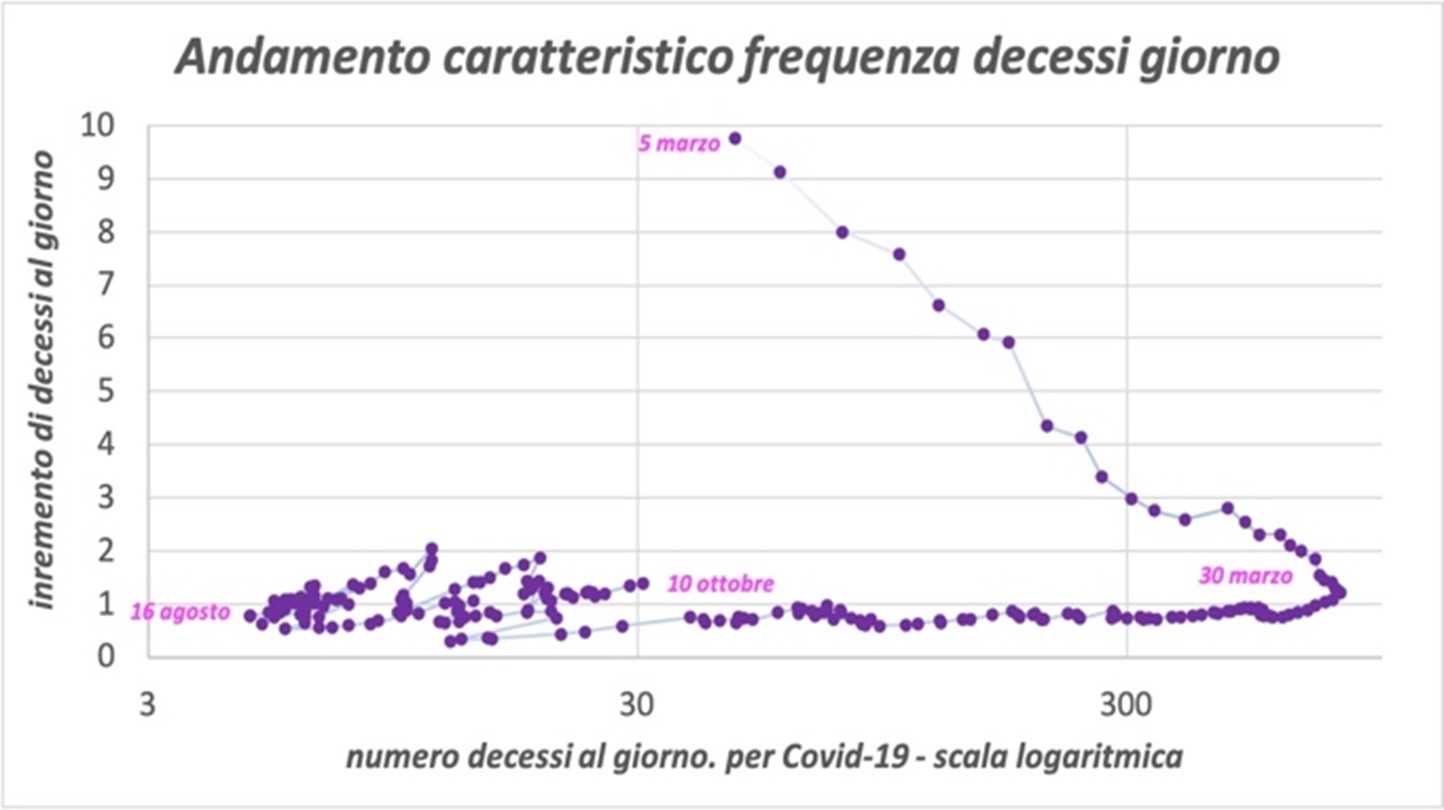Oltre alla «velocità» di espansione, o di riduzione, degli eventi considerati data dalle frequenze giornaliere si è anche calcolata una «accelerazione» mostrata dagli stessi calcolata come rapporto tra le medie mobili di un giorno e quelle di sette giorni prima. La «velocità» è mostrata nel grafico in ascissa e l’«accelerazione» in ordinata. Per ogni grafico vengono presentate due versioni: la prima con la scala originale dell’ascissa e la seconda con la scala logaritmica che permette di meglio esaminare i valori meno elevati.