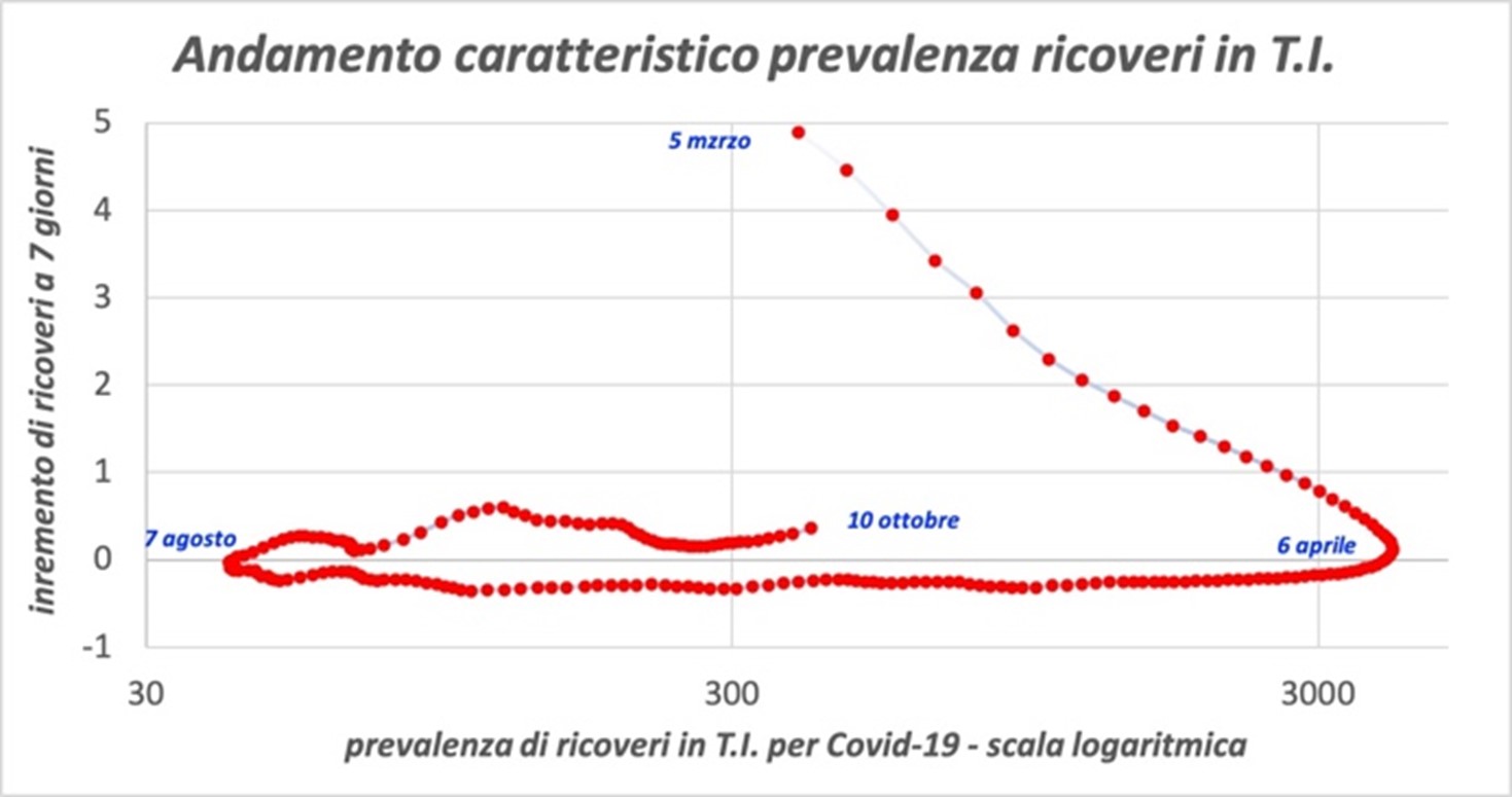 Successivamente i ricoveri sono diminuiti via via sino ad invertire la tendenza all’inizio di agosto dopo aver raggiunto la prevalenza minima di 750 ricoverati. Da allora sono via via aumentati sino a 6.009 il 14 ottobre ma con un incremento molto più lento di quello mostrato dalla prevalenza di positivi. La percentuale di ricoverati tra i casi diagnosticati è stata ad inizio marzo del 70%, ad inizio aprile del 40 %, ad inizio maggio del 20%, ad inizio giugno del 15 % e da inizio luglio in poi sempre attorno al 6/7%.
