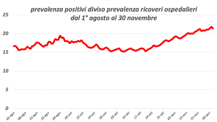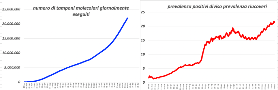 La figura 1 evidenzia come, dal 1° agosto al 30 novembre, il rapporto tra la prevalenza puntuale di positivi e la prevalenza puntuale di ricoverati sia rimasta quasi costante. In figura 2, invece, si evidenzia come il rapporto tra le due prevalenze sia cresciuto da fine febbraio a oggi, ma l’andamento della crescita può essere spiegato quasi interamente dalla crescita di test molecolari con cui risulta fortemente correlato (R2 = 0,759, cioè una correlazione dell’87,12%).