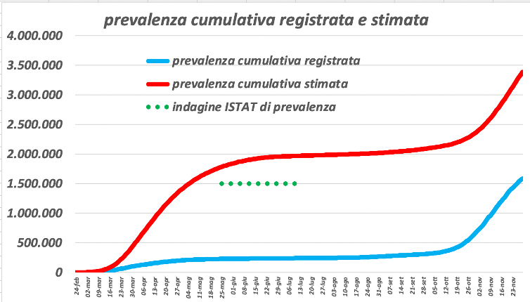 La stima della prevalenza cumulativa dell’indagine Istat, svoltasi nel mese di giugno 2020, aveva dato come indicazione circa un milione e mezzo di persone (indicata in figura con linea punteggiata) che sino ad allora erano state infettate e sicuramente questa cifra è più vicina alla stima qui eseguita che ai valori ufficiali registrati che sicuramente sottostimano la realtà.