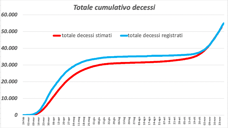 Per verificare la compatibilità delle stime effettuate si può vedere quanti risulterebbero essere i deceduti se, come misuriamo adesso, la letalità fosse sempre stata il 2% dei soggetti certificati positivi, ovvero l’1,6 di tutti i soggetti supposti tali, compresi i soggetti non individuati come positivi e che avvenga mediamente dopo 11 giorni dalla certificazione della positività (si veda di nuovo qui sul Blog SaniTAC di E&P 2/12/2020). La stima ottenuta viene riportata in figura 6.