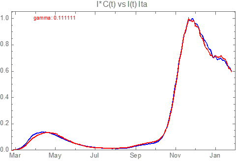 Nella Figura 8 riportiamo il caso per l’Italia: in rosso il dato $I(t)$, in blu la funzione $I^{*}(t)$, con $\gamma=0.11=1/9$ giorni. Osserviamo un ottimo accordo, ma la curva blu, $I^{*}(t)$, è leggermente più regolare di quella rossa, $I(t)$: in altri termini la curva blu segue più da vicino un andamento SIR, probabilmente correggendo anomalie presenti nel reporting quotidiano non imputabili all’epidemia.