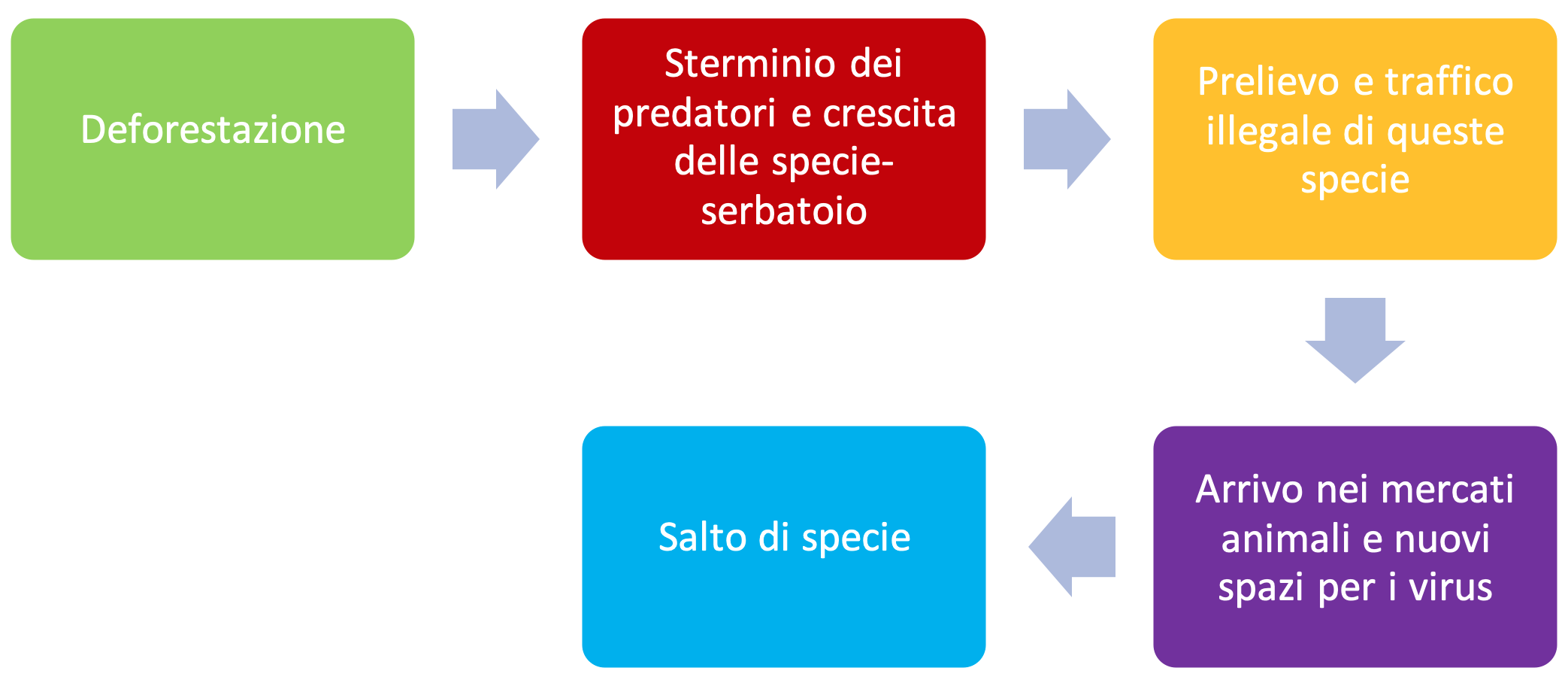 La deforestazione sembra essere il più importante fattore di aumento delle zoonosi a livello globale. Un recente report del WWF Italia afferma che l'80% della deforestazione mondiale è dovuta all’espansione dei pascoli per la produzione di carne e al diffondersi delle monocolture di soia e di caffè (soprattutto in Sud America) e delle piantagioni di palme da olio (Indonesia e Malesia). Si tratta di materie prime che sono destinate in genere all'esportazione, in particolare verso Cina, Europa e Stati Uniti. Negli ultimi trent'anni sono stati deforestati ben 420 milioni di ettari di terreni, più o meno l’equivalente della superficie dell’intera Unione Europea, gran parte dei quali in aree tropicali. Ogni anno vanno persi circa 10 milioni di ettari a causa della conversione di foreste in terreni agricoli14. Oggigiorno, quindi, lo sviluppo di una pandemia potrebbe seguire una sequenza che si può sintetizzare così: 1) deforestazione, 2) perdita o sterminio dei predatori e crescita senza limiti delle specie-serbatoio, 3) prelievo e traffico illegale di questa specie, 4) mercati animali umidi, 5) salto di specie (Figura 1).