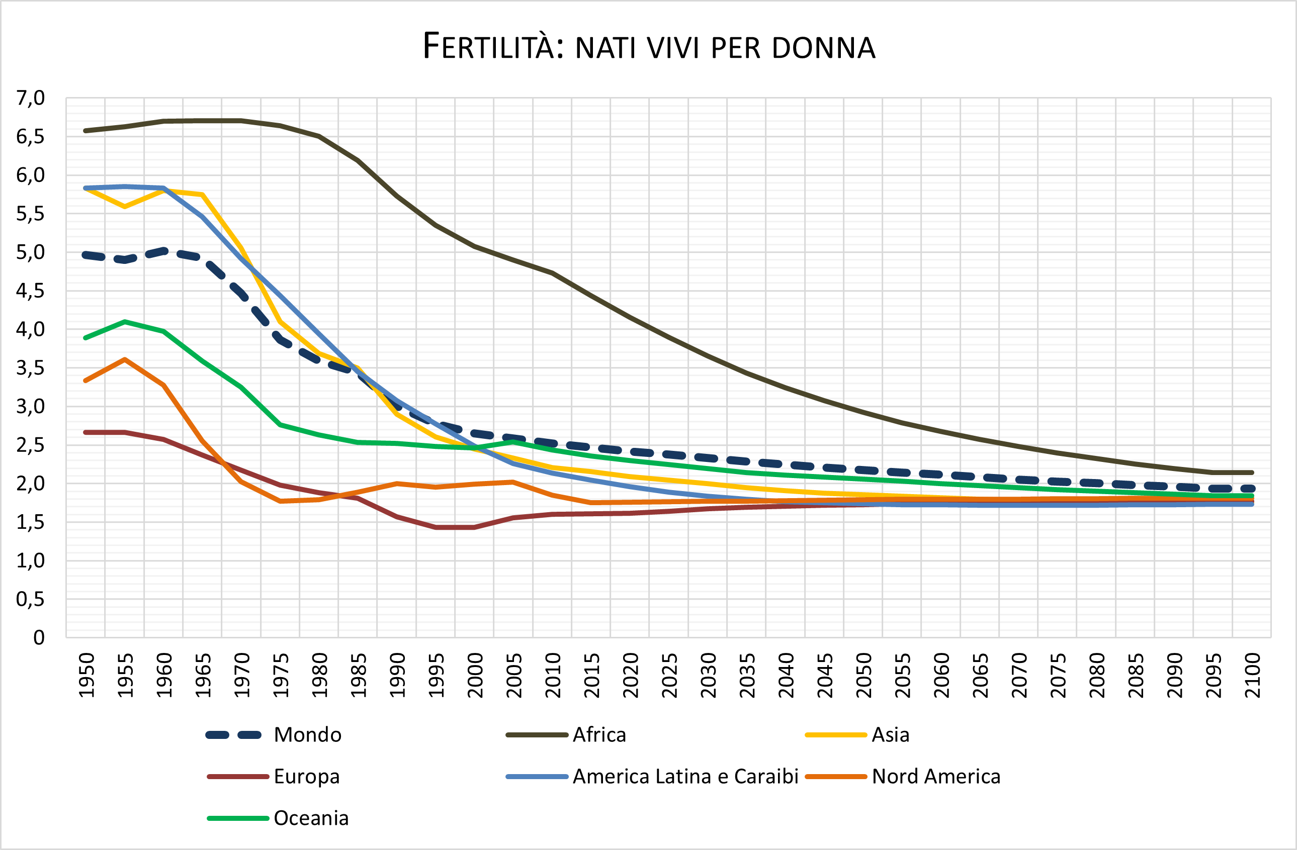 Come si può osservare dal grafico seguente, il rallentamento demografico può essere descritto, tra le varie possibili variabili, dal progressivo abbassamento dei «nati vivi per donna», cioè la fertilità. Tra il 1950 e il 1970, il numero di nati vivi per donna era globalmente attorno ai 5, con punte fino a 5,5 in Asia e America Latina e addirittura oltre i 6 figli e mezzo in Africa (vedi grafico in Appendice). Oggi siamo attorno ai 2,5 e per fine secolo dovremmo raggiungere a livello planetario i 2, in più o meno tutti i continenti. A questo proposito, il prospetto ONU ricorda che, con una bassa mortalità, il numero di nati vivi per donna per avere un tasso di crescita nullo è di 2,1 figli.