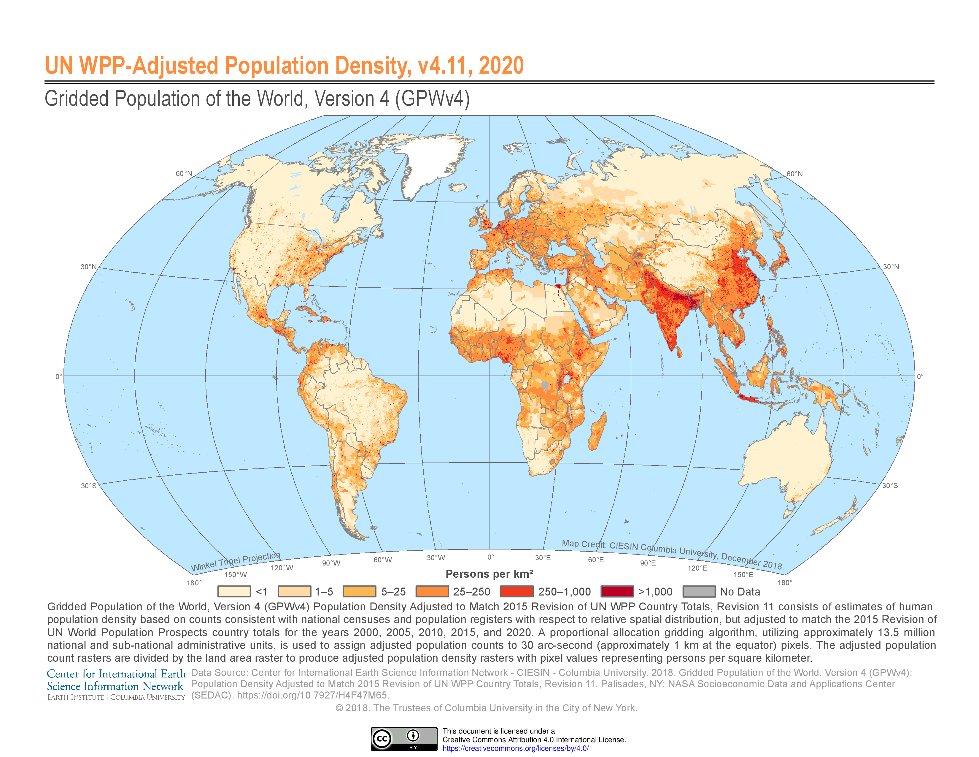 Figura 1. Densità di popolazione stimata per il 2020 dal Socioeconomic Data and Applications Center (SEDAC).