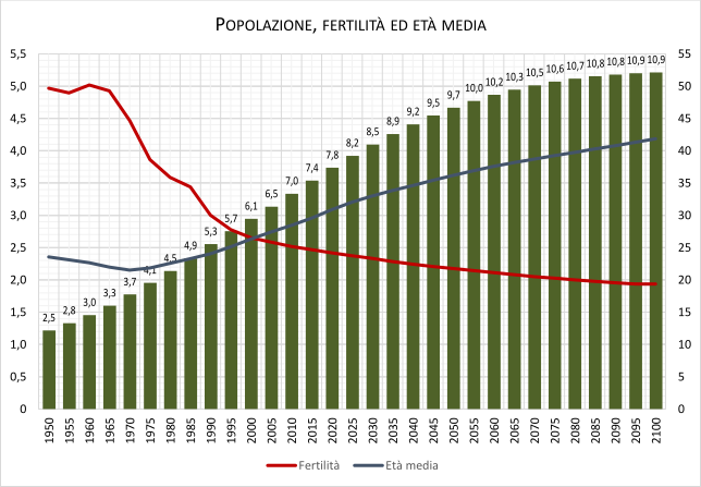 Figura 3. Il grafico riporta negli istogrammi l’andamento della popolazione (in miliardi di persone), nelle due linee colorate l’andamento della fertilità (numero di nati vivi per donna: valori nella colonna di sinistra) e l’andamento dell’età media (in anni: valori nella colonna di destra).