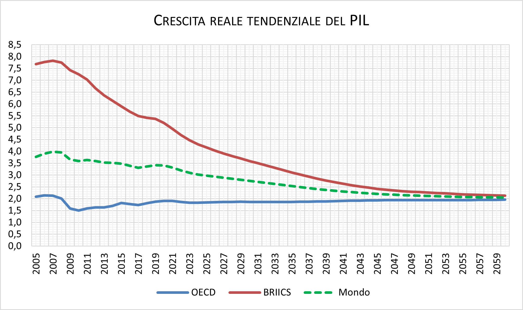 Figura 4. Rielaborazione dei dati OCSE di previsione di crescita del PIL (in %). I paesi del gruppo OCSE (Australia, Austria, Belgio, Canada, Cile, Colombia, Danimarca, Estonia, Finlandia, Francia, Germania, Giappone, Gran Bretagna, Grecia, Irlanda, Islanda, Israele, Italia, Lettonia, Lituania, Lussemburgo, Messico, Norvegia, Nuova Zelanda, Paesi Bassi, Polonia, Portogallo, Repubblica Ceca, Repubblica di Corea, Repubblica Slovacca, Slovenia, Spagna, Stati Uniti, Svezia, Svizzera, Turchia, Ungheria) sono già di fatto in stagnazione e i BRIICS (Brasile, Russia, India, Indonesia, Cina e Sud Africa) ci entreranno progressivamente. Dati: «The long view: scenarios for the world economy to 2060». Rielaborazione dell’autore.