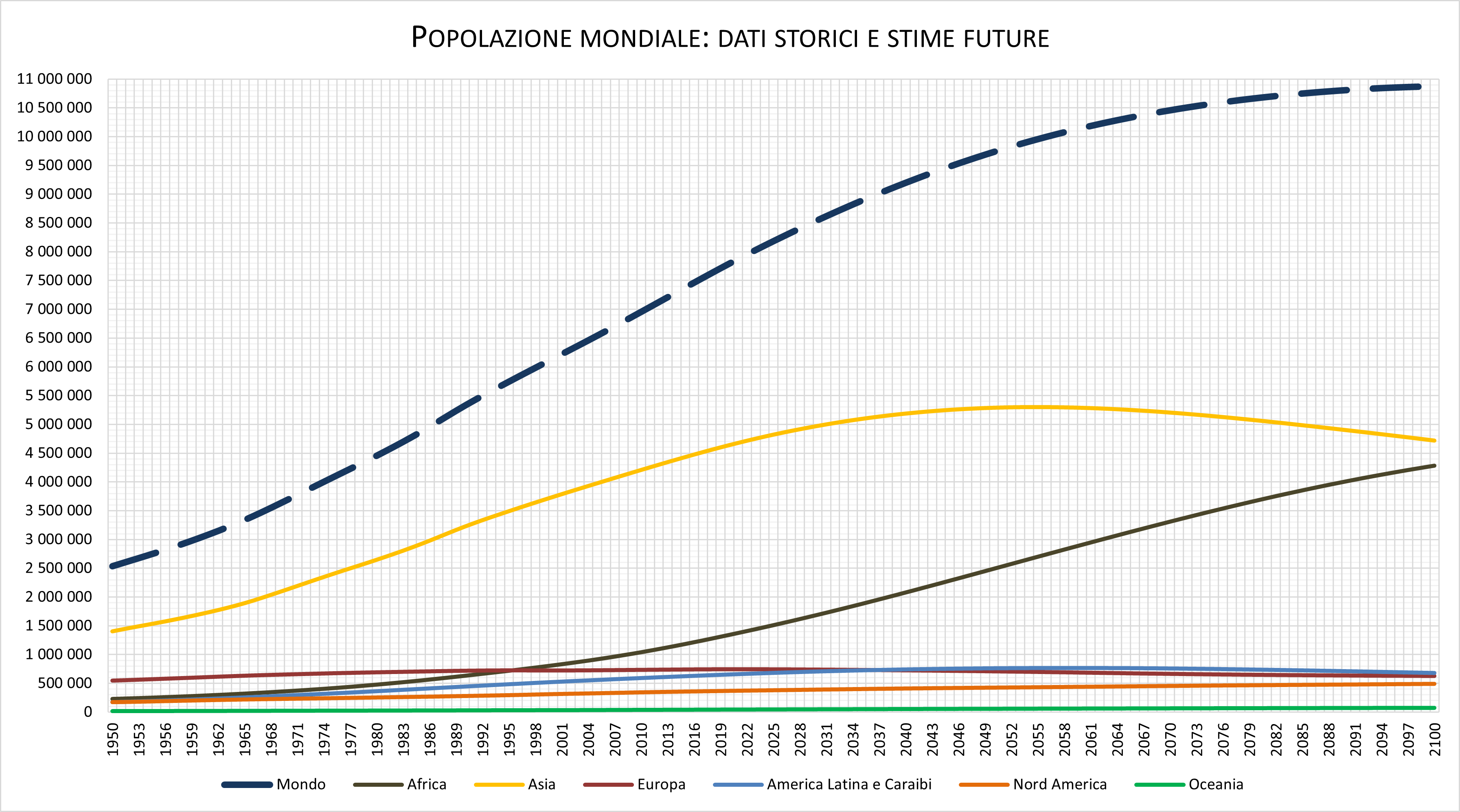Complessivamente, quindi, si può dire che la crescita della popolazione mondiale non è più esponenziale da diversi anni, avendo raggiunto una sorta di «punto di flesso» indicativamente al passaggio di millennio, lustro più lustro meno. Tuttavia, prima di raggiungere un plateau che oscillerebbe intorno alla fine del secolo, dovremmo prima passare dagli 8,5 miliardi nel 2030, ai 9,7 miliardi nel 2050 e finalmente ai 10,9 miliardi nel 2100.