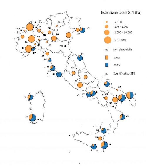 Nella figura i siti nazionali (SIN), attualmente 42. E sono: Venezia (P. Marghera), Napoli Orientale, Gela, Priolo, Manfredonia, Brindisi, Taranto, Cengio e Saliceto, Piombino, Massa e Carrara, Casal Monferrato, Balangero, Pieve Vergonte, Sesto San Giovanni, Pioltello - Rodano, Napoli Bagnoli - Coroglio, Tito, Crotone - Cassano - Cerchiara, Fidenza, Laguna di Grado e Marano, Trieste, Cogoleto, Bari, Sulcis, Biancavilla, Livorno, Terni, Emarese, Trento nord, Brescia, Broni, Falconara Marittima, Serravalle Scrivia, Laghi di Mantova, Orbetello, Porto Torres, Val Basento, Milazzo, Bussi sul Tirino, Bacino fiume Sacco, Officine Grandi riparazioni ETR Bologna, Giugliano (Na). Altri 9 SIN sono stati attribuiti alle competenze regionali. Il complesso di questi siti principali (nazionali e regionali) ammonta al 3% del territorio, per un totale di circa il 10% della popolazione.