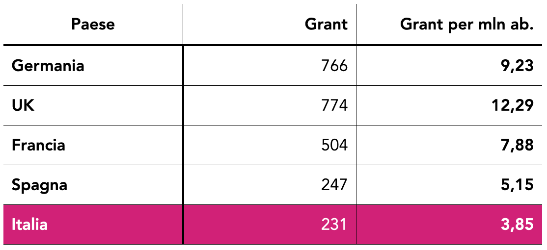 Se si guarda, però, alla classifica dei ricercatori vincitori di grant per nazionalità, ci posizioniamo molto meglio, allo stesso livello di Francia e Regno Unito e subito dietro la Germania. Il risultato dei ricercatori italiani è particolarmente buono per gli Starting Grant e i Consolidator Grant, su cui abbiamo addirittura superato la Germania nel 2020, mentre per gli Advanced Grant siamo più indietro.