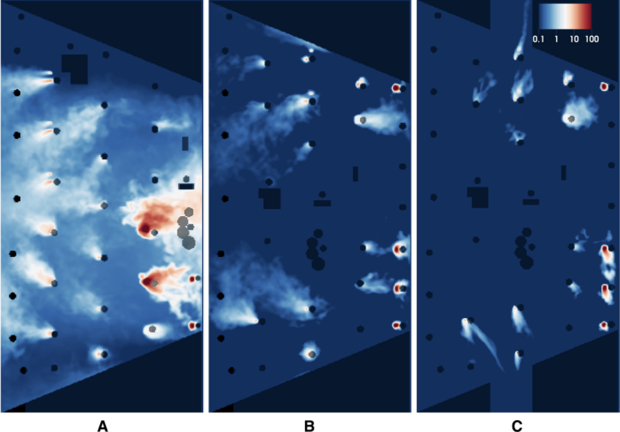 Le concentrazioni di aerosol nell’intervallo di altezza tra 0,9 e 1,3 metri. A: configurazione standard con il solo distanziamento fisico di due metri. B: redistribuzione degli strumentisti più emissivi vicino alle bocchette e lontani da ricircoli d’aria. C: stessa configurazione di B con anche le porte aperte. La mappa dei colori varia da 0,1 a 100 particelle per litro su una scala logica. Immagine originale.