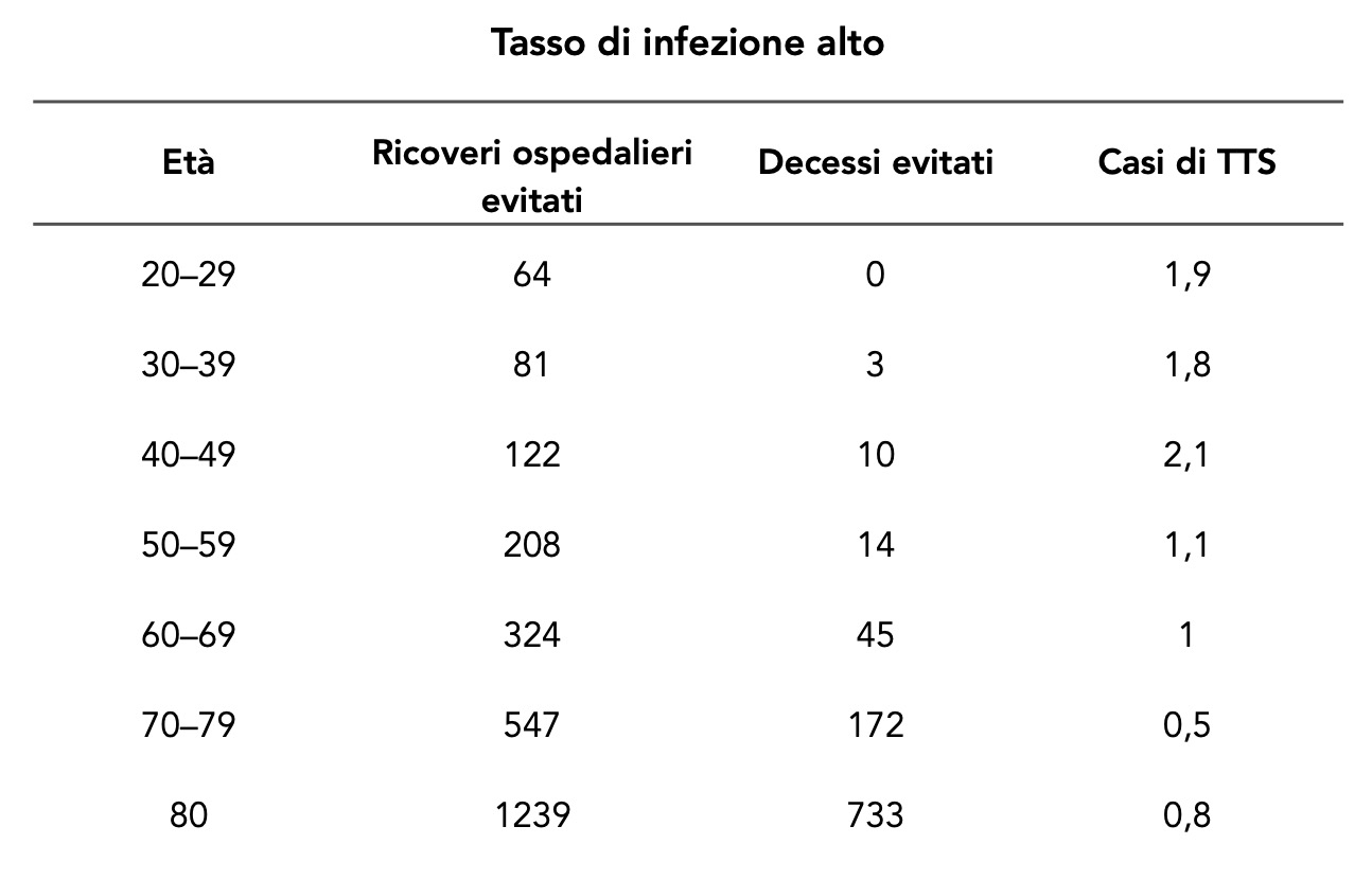 E se la TTS fosse un (sia pur rarissimo) effetto di classe, riguardando tutti i vaccini a vettore adenovirale (ma sono ancora insufficienti i dati sugli altri due vaccini ad adenovirus, il russo Sputnik V e il vaccino cinese di CanSino Biologics)? Sarebbe sufficiente questo a segnare la fine del loro successo? Se lo sono chiesti il gruppo di Dimitrios Tsilingiris dell'Università di Atene sulla rivista Metabolism Open e Kai Kupferschmidt, giornalista scientifico della rivista Science, il quale invita a ricordare che, in un determinato paese, il bilancio rischi-benefici dei vaccini a vettore adenovirale è funzione non solo della fascia d’età dei vaccinandi, ma anche del vigente tasso d’infettività di SARS-CoV-2. Questo rilievo è di primaria importanza se si guarda oltre i confini del mondo occidentale, a quella parte di umanità che aspetta ancora di essere immunizzata contro il coronavirus: i vaccini ad adenovirus sono la pietra angolare della Vaccines Global Access (COVAX) Facility, che è deputata a vaccinare i paesi in via di sviluppo. Lo spiegano bene le due tabelle sottostanti, elaborate da EMA.