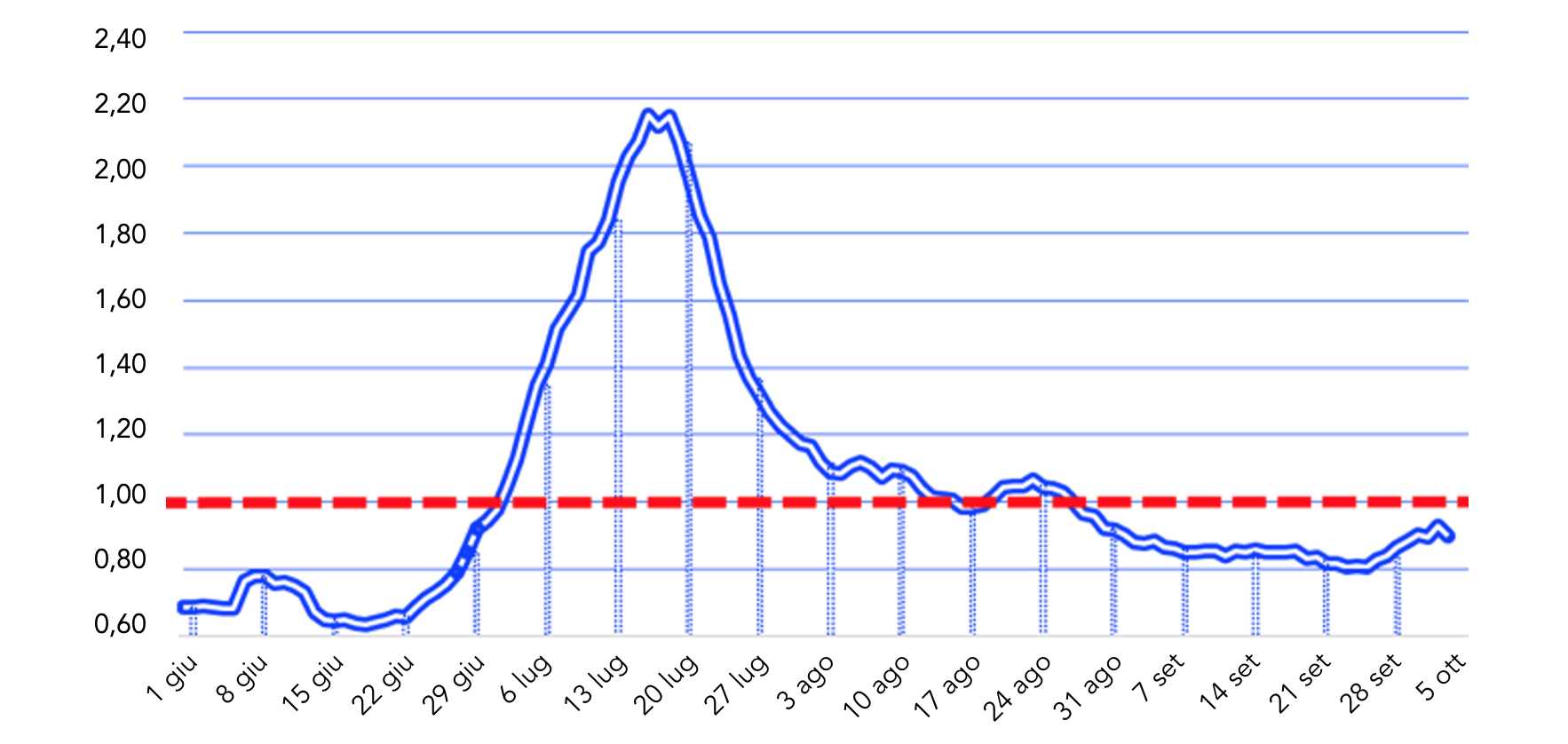 Indice di replicazione diagnostica regionale calcolato il 7 ottobre (settimana 24/9-30/9 su settimana 1/10-7/10)
