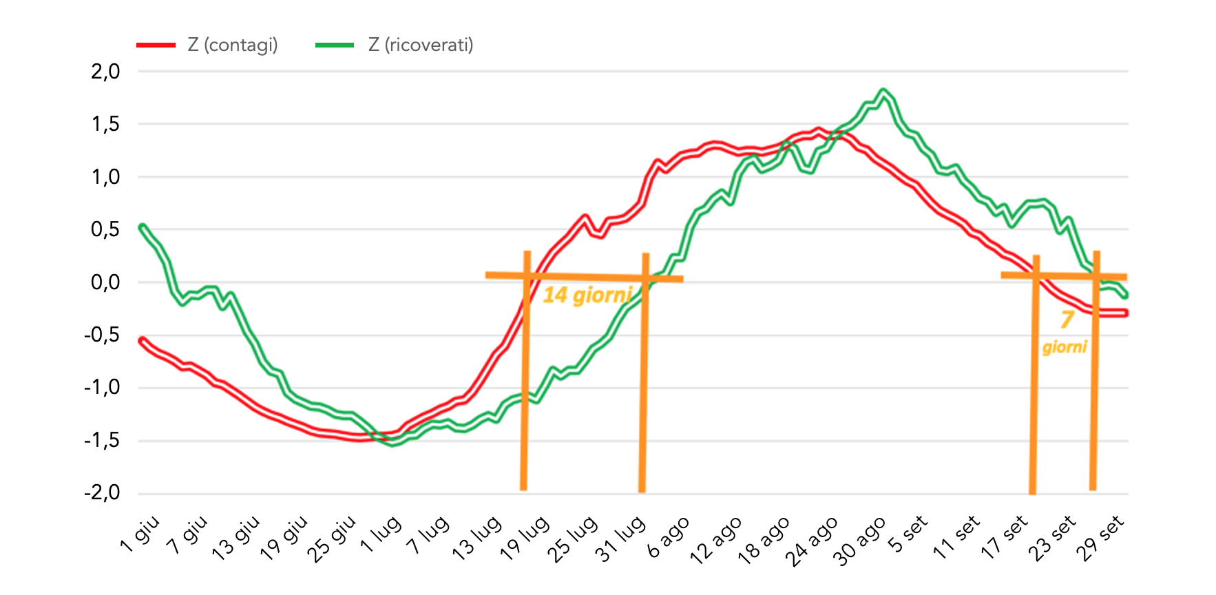 Calcolando delle frequenze standardizzate delle medie mobili settimanali, il trend dei decessi appare in questa fase simile al trend dei contagi ma traslato in avanti tra i 21 e i 28 giorni. È allora possibile ipotizzare che la letalità sia il rapporto tra la frequenza di decessi e la frequenza di contagi diagnosticati tra i 21 e i 28 giorni precedenti. Il risultato dà una tendenza in diminuzione se si sceglie un tempo di latenza di 28 giorni, e invece una tendenza invece piatta se il tempo di latenza è di 21 giorni.