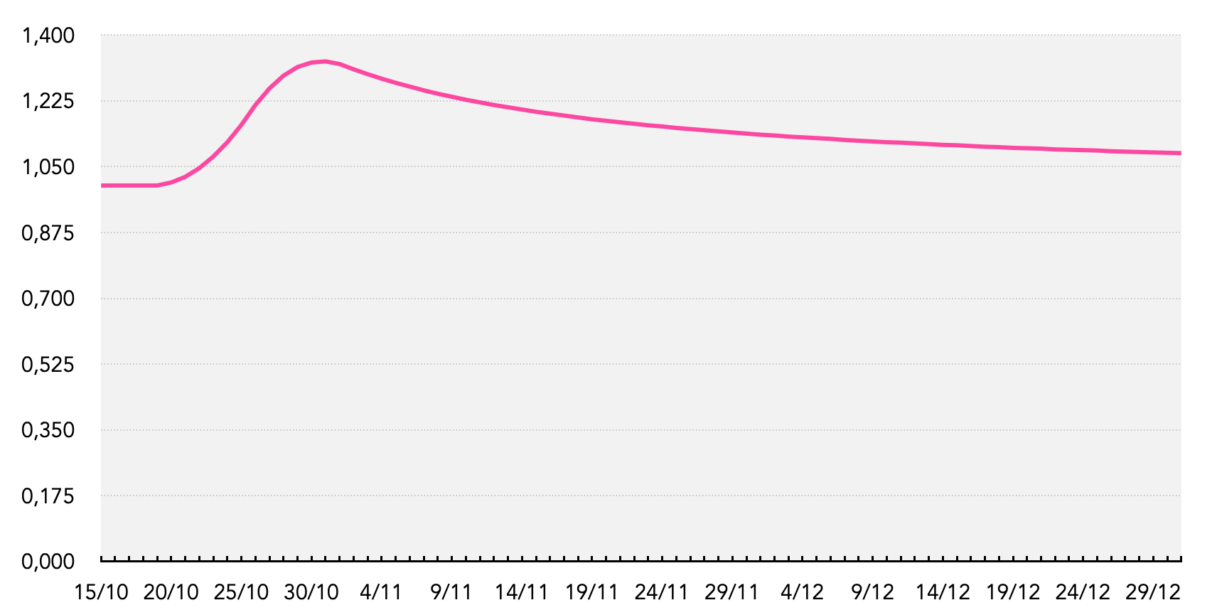 La crescita ipotizzata è una crescita lineare che aumenta di 150 casi ogni giorno e che farebbe superare la frequenza giornaliera di 10 000 casi positivi a inizio dicembre. Si osservi che in caso di crescita lineare, l'indice di replicazione diagnostica dopo un punto di massimo avrebbe una lenta decrescita che non deve portare a pensare che corrisponda alla diminuzione dei casi giornalieri ma solo a una diminuzione della percentuale dell'incremento.