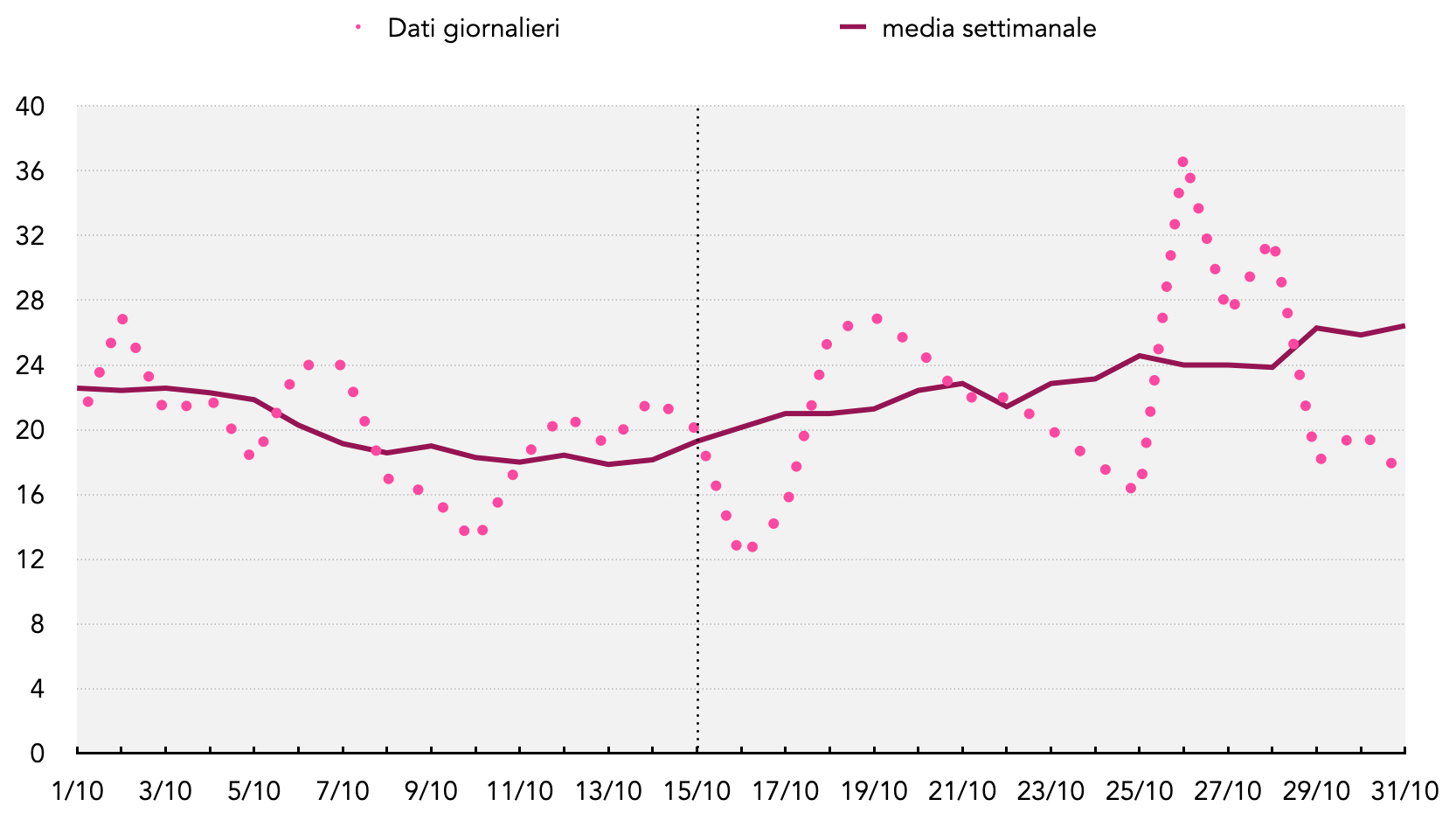 Si può osservare chiaramente come i tamponi molecolari non abbiano avuto variazioni di frequenze importanti mentre i tamponi antigenici, che a inizio mese erano attorno ai 180 000 sono esattamente raddoppiati da metà mese in poi. I contagi, infine, sono aumentati proprio a partire da metà mese. Si osservi anche che, mentre per contagi e tamponi molecolari si ha un ciclo settimanale costante con il minimo di lunedì, per i tamponi molecolari la variabilità è differente e non uniforme da una settimana all'altra. Si consideri infine che i dati calanti di fine mese dipendono anche dalla riduzione di attività diagnostica dovuta al ponte del 1° novembre.