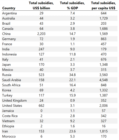 Tabella dei sussidi ai combustibili fossili per paese (totali, in % di PIL, pro-capite) tratta dai sopracitati dati del Fondo Monetario Internazionale.