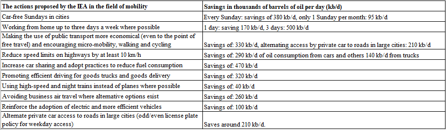 L’indicazione ci viene direttamente dall’Agenzia Internazionale per l’Energia (IEA), la quale ha calcolato che alcune azioni immediate nelle economie avanzate, che rappresentano circa il 45% della domanda mondiale di petrolio, ma estensibili a più Paesi, potrebbero ridurre la domanda di petrolio di 2,7 milioni di barili al giorno nei prossimi 4 mesi. L'IEA propone dieci azioni immediate nel settore dei trasporti, tra cui nove di sufficienza e una di aumento dell’efficienza tecnologica.