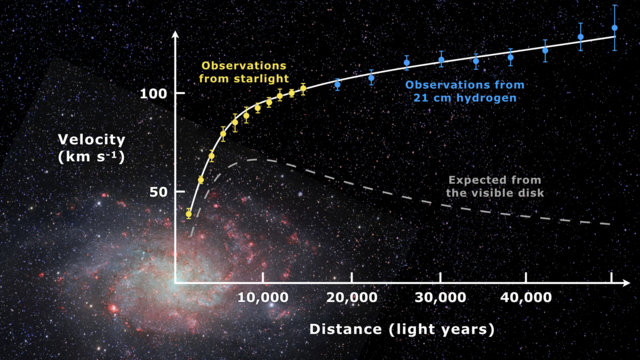 La curva di rotazione di Andromeda costruita da Rubin, invece, era piatta: le stelle più lontane dal centro galattico si muovevano alla stessa velocità di quelle centrali, implicando che dovesse essere presente una gran quantità di massa oscura nella periferia della galassia per rendere conto delle osservazioni. Tale massa sarebbe soggetta a interazione gravitazionale, ma non elettromagnetica, e a questo sarebbe dovuta la sua invisibilità.