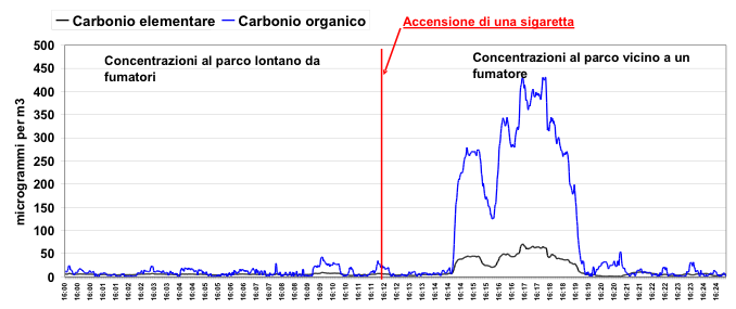 Misurazione diretta in un parco milanese della quantità di carbonio elementare (in nero) e organico (in blu, di cui è ricco il fumo di sigaretta), lontano e poi vicino a un fumatore, per dimostrare come anche all’aria aperta, stare intorno a chi fuma nuoce alla salute.