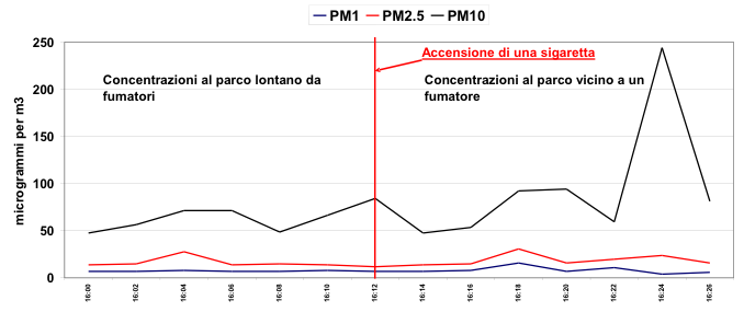 Misurazione diretta in un parco milanese della quantità di polveri (PM10 in nero; PM2,5 in rosso; PM1 in blu), lontano e poi vicino a un fumatore, per dimostrare come anche all’aria aperta, stare intorno a chi fuma nuoce alla salute.
