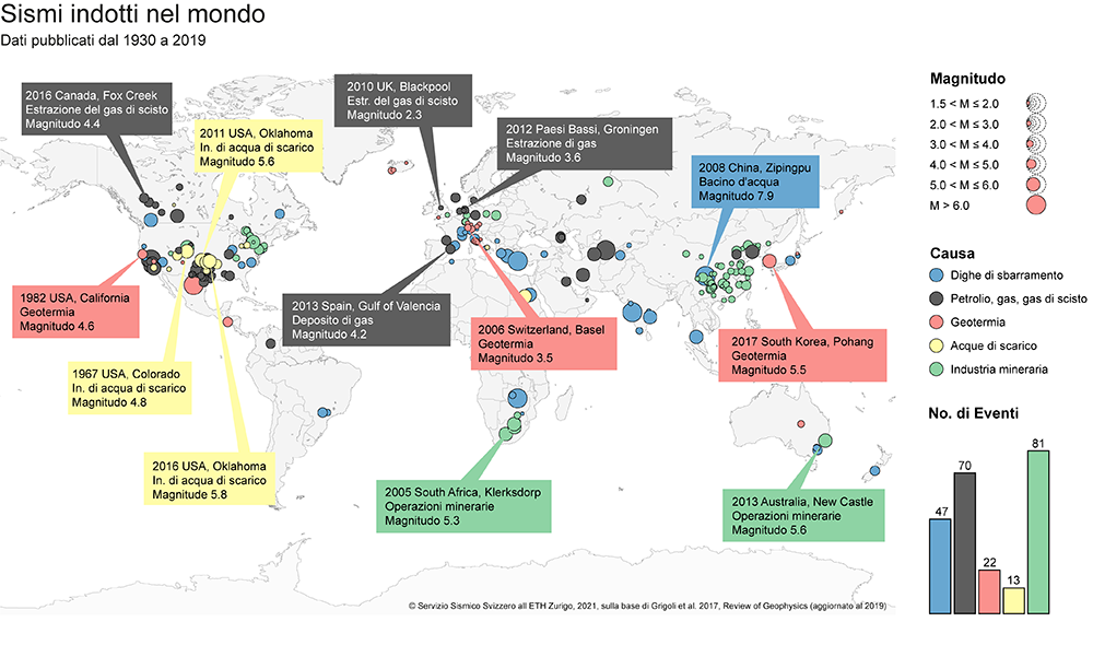 Le cause principali, secondo il database, sono fracking (cioè la fratturazione del sottosuolo con un liquido a fini estrattivi), ricerche minerarie, bacini idrici di contenimento, estrazione di gas e petrolio, geotermia, smaltimento di rifiuti fluidi ed esplosioni nucleari, oltre che altre meno importanti. Di seguito un’immagine (anche interattiva) del Servizio Sismologico Svizzero.