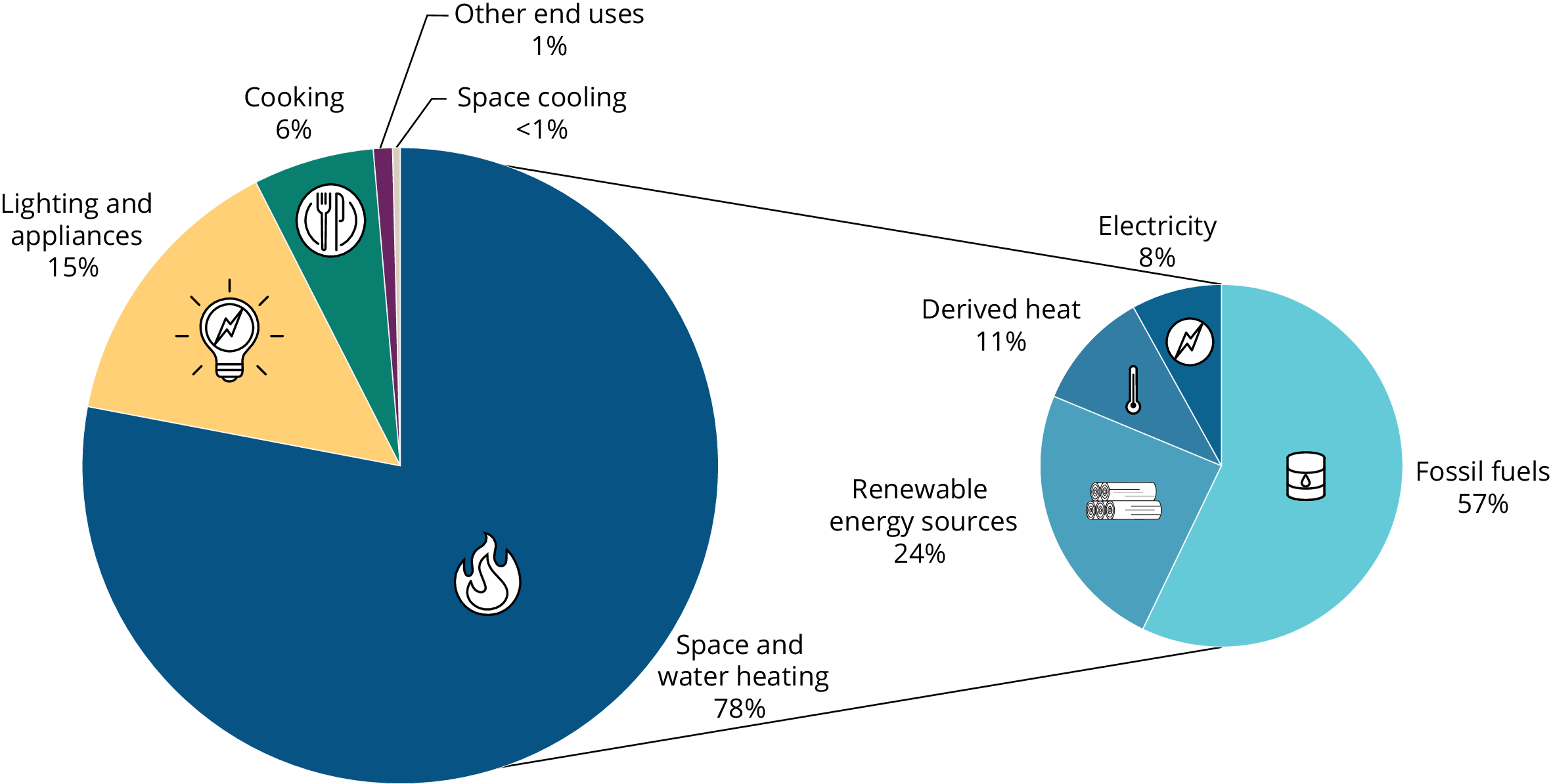Di tutta l’energia finale utilizzata, gli edifici ne hanno consumata il 42% nel 2020 (rappresentando il 35% delle emissioni di gas serra relative alla produzione di energia in Europa), il 67% della quale è stata consumata dalle famiglie. I trasporti rappresentano il 28% e l’industria il 26%. Per quanto riguarda quest’ultima, il calore è necessario prevalentemente per raggiungere alte temperature nella metallurgia e nella ceramica e per la produzione di vapore a bassa temperatura e agenti refrigeranti nell'industria alimentare e tessile.