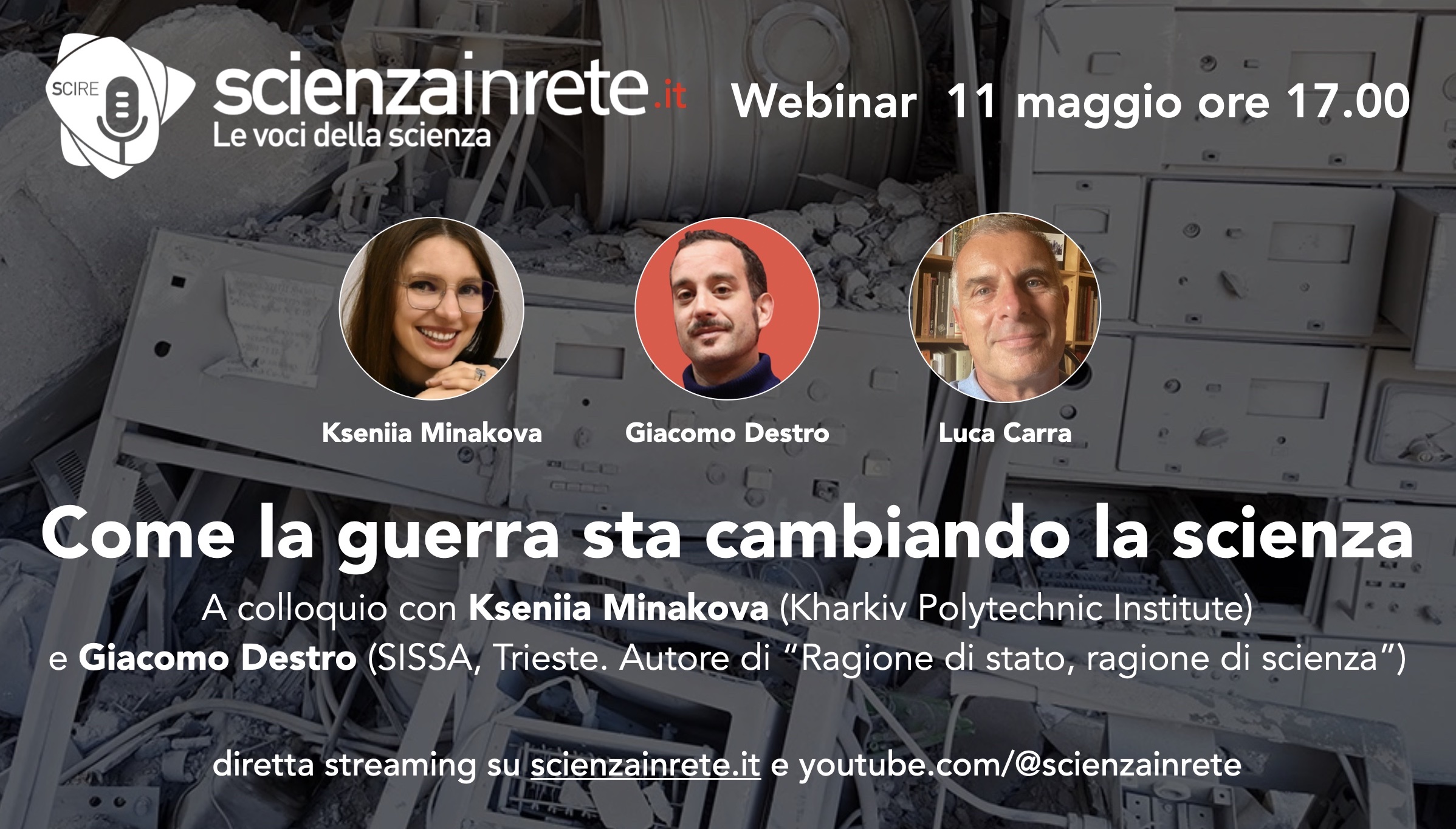 La guerra in Ucraina ha sconvolto la vita in molte aree della regione e ha messo in difficoltà anche l’attività degli scienziati. Ne parliamo giovedì 11 maggio con Kseniia Minakova, fisica dell'università di Kharkiv a cui i bombardamenti russi hanno distrutto il laboratorio e Giacomo Destro, della SISSA di Trieste, autore di “Ragione di stato, ragione di scienza”.