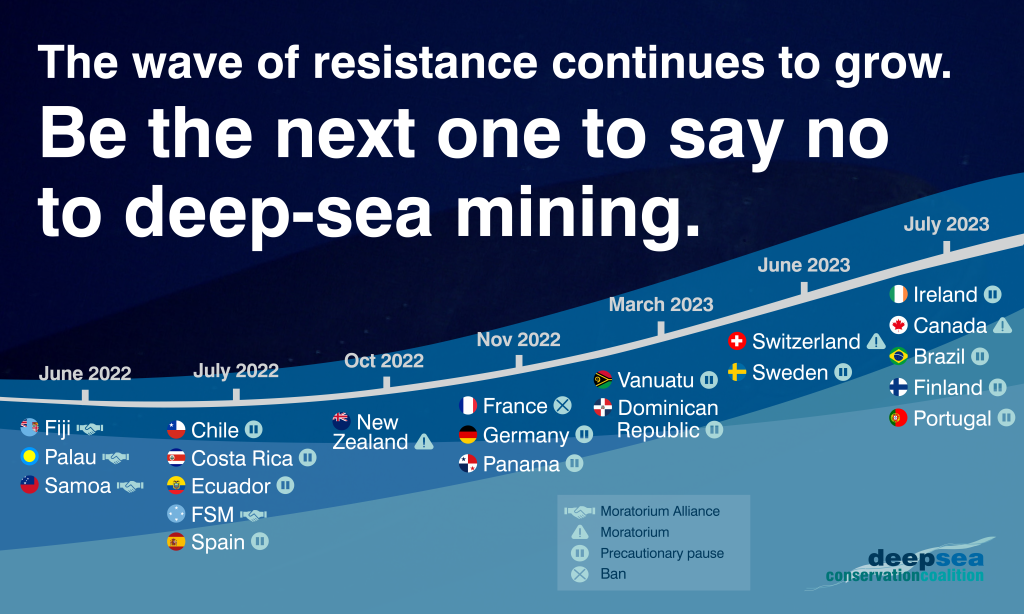 Sul fronte ambientalista sono nate diverse iniziative per bloccare lo sfruttamento minerario degli oceani. Il WWF nel 2021 ha chiesto una moratoria su tutte le attività minerarie sui fondali marini, sostenendo che esistono soluzioni alternative e che una combinazione di innovazione, riciclaggio e riparazione dei dispositivi, può soddisfare il bisogno di materie prime delle industrie senza bisogno di ricorrere allo sfruttamento del fondale marino. La moratoria proposta dal WWF è stata firmata anche da BMW Group, Samsung, Google e Volvo Group, a cui poi si sono aggiunte altre aziende. I firmatari si impegnano a non utilizzare minerali provenienti dalle profondità marine nelle loro catene di approvvigionamento e a non finanziare attività minerarie in acque profonde.