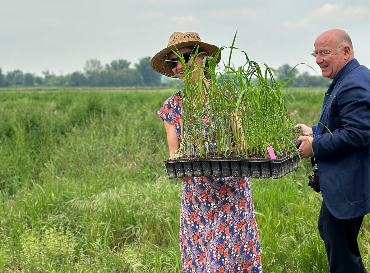 Giornata storica il 13 maggio: Vittoria Brambilla e Fabio Fornara di Unimi hanno messo a dimora le prime piantine di riso geneticamente editate TEA (tecniche CRISPR di evoluzione assistita) per resistere a parassiti come il brusone senza usare fitofarmaci, nella campagna pavese di Mezzana Bigli. Si tratta di una sperimentazione, ma in campo aperto, il primo consentito in Italia. Il permesso è fino a fine anno, ma prorogabile in attesa delle nuove regole europee. All'evento erano presenti una piccola folla di amici delle biotecnologie, tra cui spiccano la senatrice a vita Elena Cattaneo e Marco Cappato dell’associazione Luca Coscioni. Era presente anche la giornalista Anna Meldolesi, che firma l'articolo, e il ricercatore CNR Roberto Defez, nella foto insieme a Vittoria Brambilla. Credito foto: Associazione Luca Coscioni.