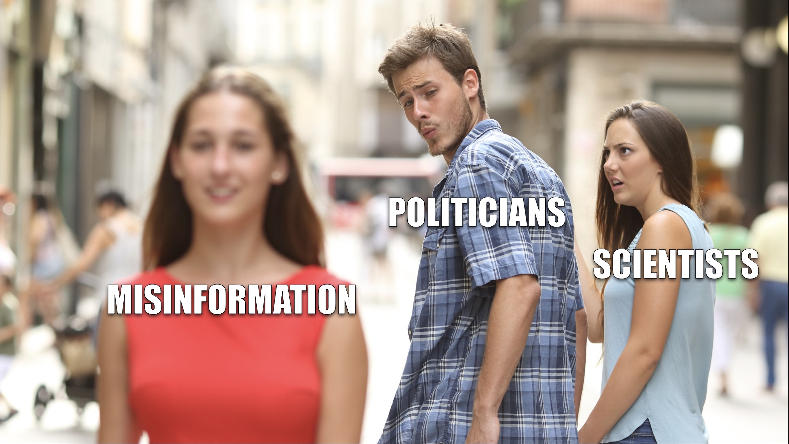 La consulenza scientifica ai governi è in crisi: l'80% degli esperti giudica inefficaci i sistemi attuali. Il 78% ritiene che i politici ignorino i pareri scientifici, mentre il 73% nota che i ricercatori non comprendono i processi politici. La disinformazione ostacola ulteriormente il dialogo, minando la fiducia nelle prove scientifiche. Ma c'è dell'altro. Immagine: Distracted boyfriend meme, Antonio Guillem, Wikipedia.