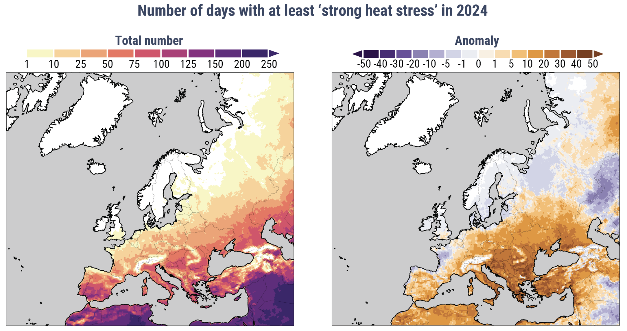 Figura 5. A day with at least 'strong heat stress' has a maximum feels-like temperature (UTCI) of at least 32°C. Data: ERA5-HEAT UTCI • Reference period: 1991-2020 (right) • Credit: C3S/ECMWF