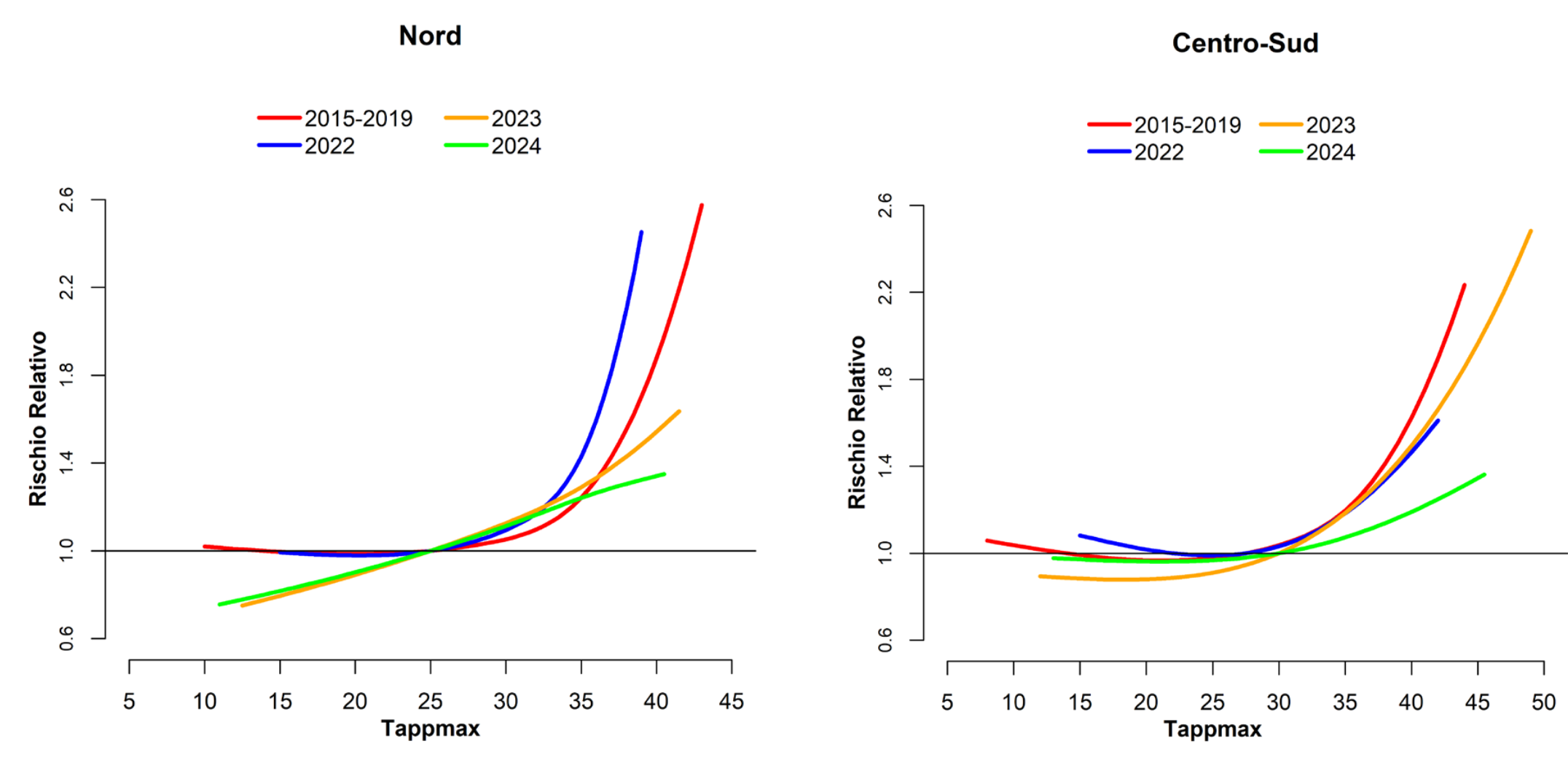 Figura 3. Relazione temperatura/mortalità per le città Italiane del Nord (sinistra) e del Centro-Sud (destra) nel periodo estivo per il 2024, 2023, 2022, e nel periodo di riferimento (2015-2019). Fonte: "Risultati dei Sistemi di allarme (HHWWS) e del Sistema di Sorveglianza della Mortalità Giornaliera (SiSMG) e degli accessi in pronto soccorso. Sintesi dei risultati estate 2024", DEP Lazio.